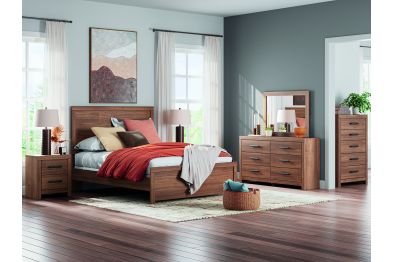 With its rich, warm auburn finish over replicated wood grain, this casually cozy queen panel bed evokes the tranquil vibe you long for in your dream destination. Its invitingly comfy aesthetic is ready to welcome you home. Sweet dreams.