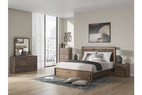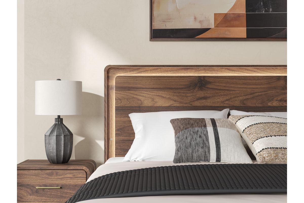 Grace your restful retreat with an added dose of refinement. This panel bed showcases a stunning rich brown wood tone, while the rounded frame softens its silhouette to elevate the look. And it seamlessly incorporates forward-thinking function, with an LED backlight in the headboard that can be easily accessed from both sides of the bed. Its curated, contemporary and utterly chic.