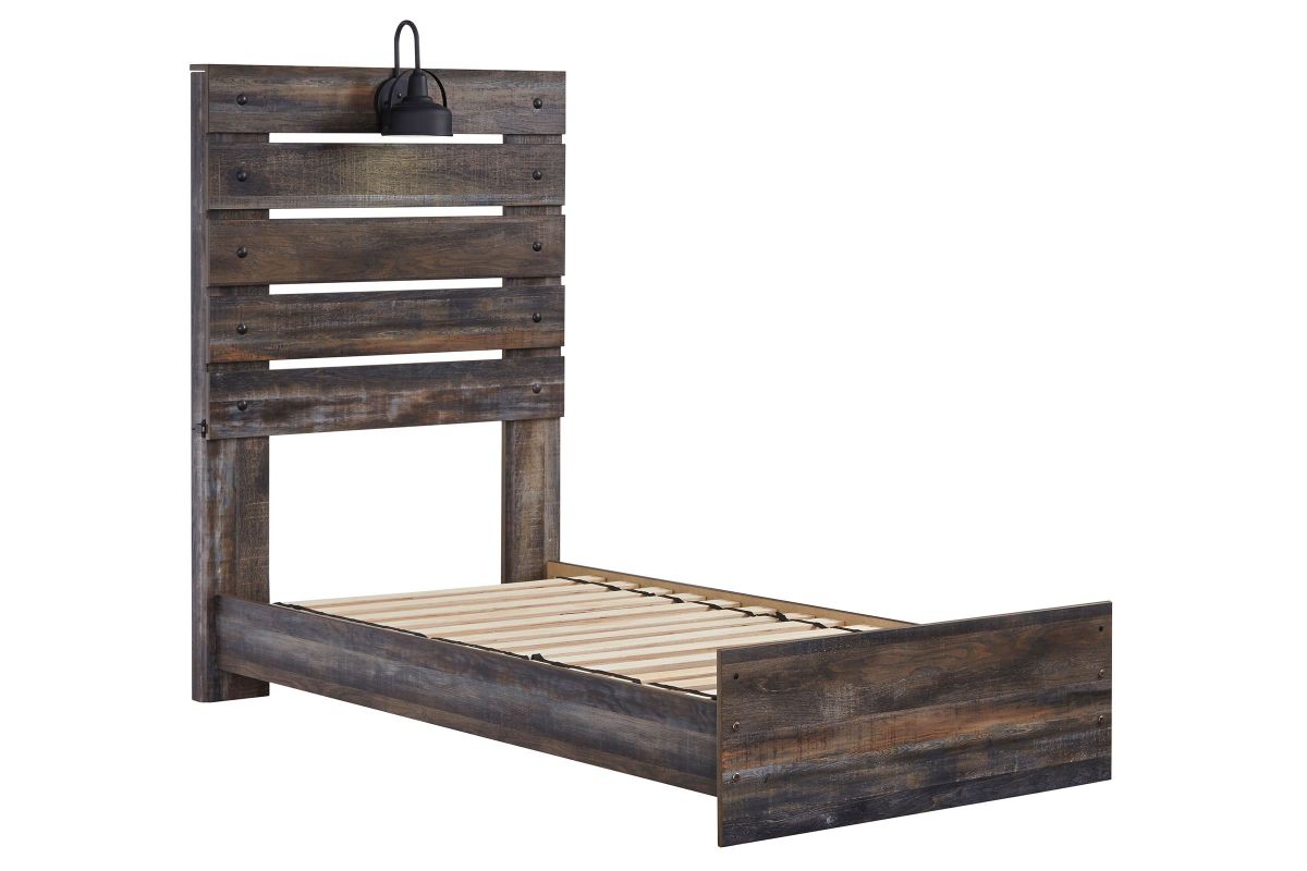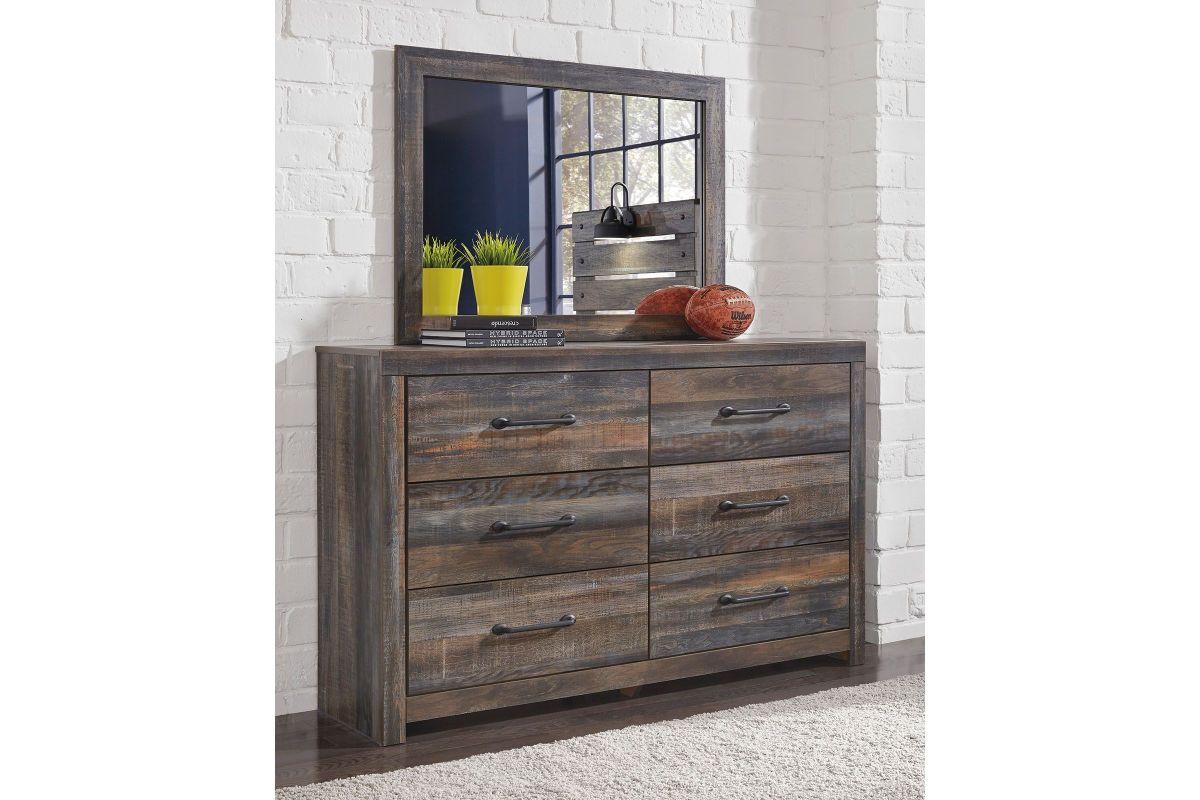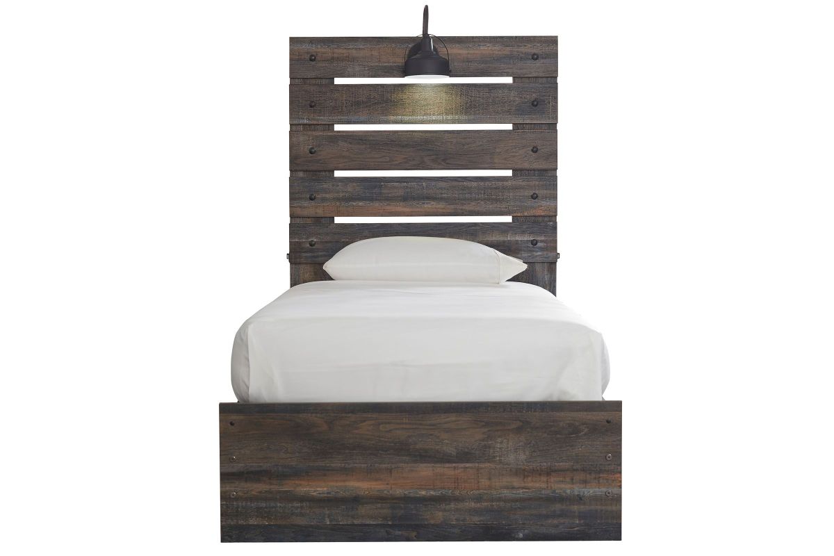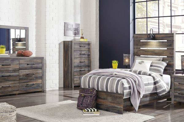 The rustic barn wood brown finish over a replicated oak grain adds a unique touch to the Wilder Twin Size Bedroom Set. The Twin size bed has one decorative black matte sconce lamps and the slatted panel headboard is accented with similar black matte pegs. The dresser with mirror has matching large scale black matte handles and 6 spacious storage drawers. The nightstand has 2 drawers, black matte handles and dual USB chargers located on the back. The drawers on the Wilder Collection are lined with a faux linen laminate for a clean, finished look.