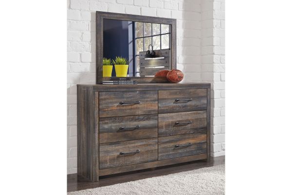 The rustic barn wood brown finish over a replicated oak grain adds a unique touch to the Wilder Queen Size Bedroom Set. The Queen size bed has two decorative black matte sconce lamps and the slatted panel headboard is accented with similar black matte pegs. The dresser with mirror has matching large scale black matte handles and 6 spacious storage drawers.