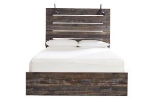 When merged in just the right way, rustic and industrial styles can make one happy marriage. Case in point: the Wilder bedroom set with panel bed, chest, dresser, mirror, and nightstand. A refined take on barn board beauty, its complex, replicated wood grain showcases hints of burnt orange and teal tones for a sense of weatherworn authenticity. Those who love to read in bed are sure to find the retro-chic light sconce and USB plug-ins on the open-slat style headboard such a bright idea. Additional USB plug-ins with the nightstand keep you up to speed.