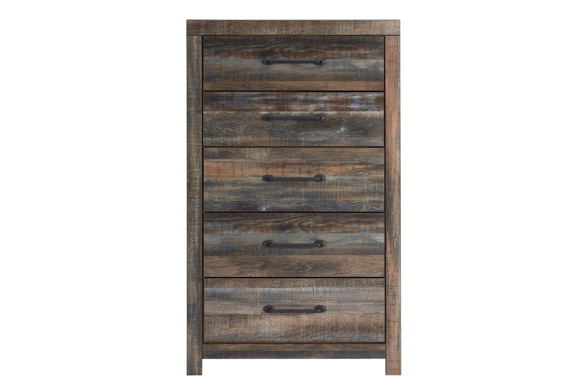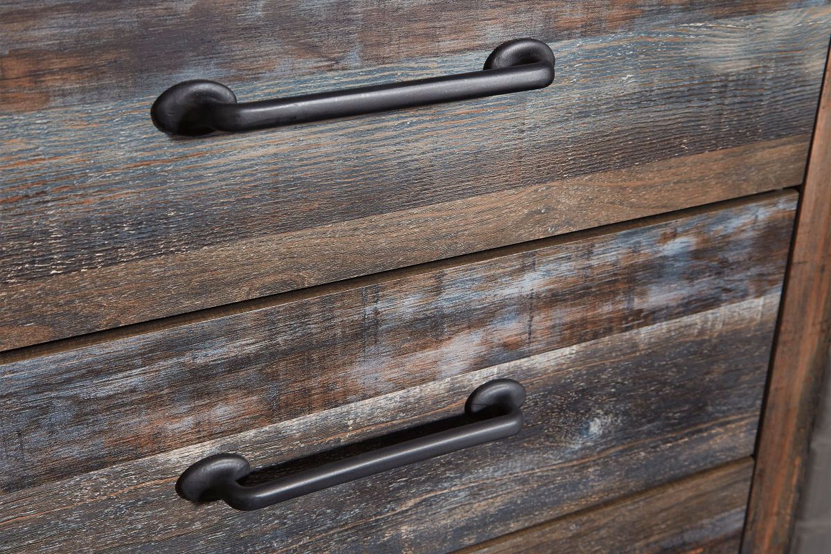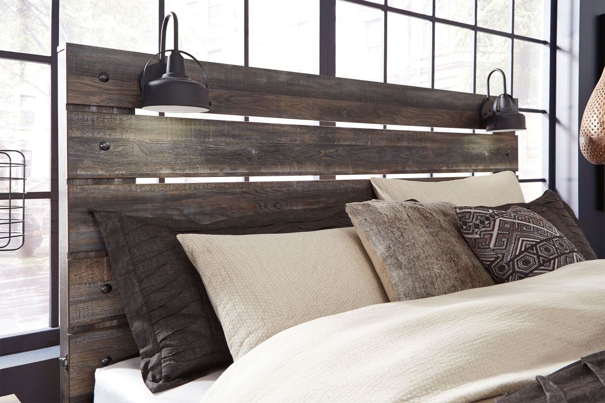 When merged in just the right way, rustic and industrial styles can make one happy marriage. Case in point: the Wilder bedroom set with panel bed, chest, dresser, mirror, and nightstand. A refined take on barn board beauty, its complex, replicated wood grain showcases hints of burnt orange and teal tones for a sense of weatherworn authenticity. Those who love to read in bed are sure to find the retro-chic light sconce and USB plug-ins on the open-slat style headboard such a bright idea. Additional USB plug-ins with the nightstand keep you up to speed.