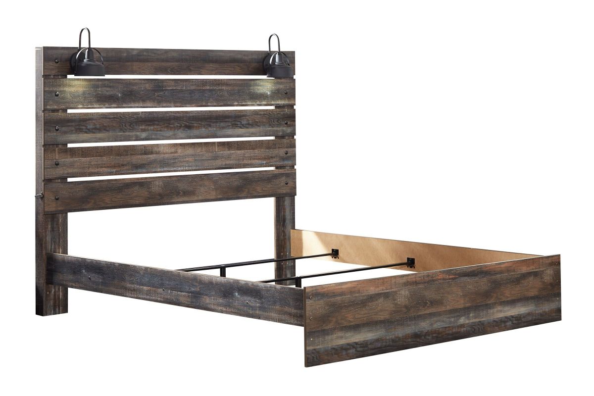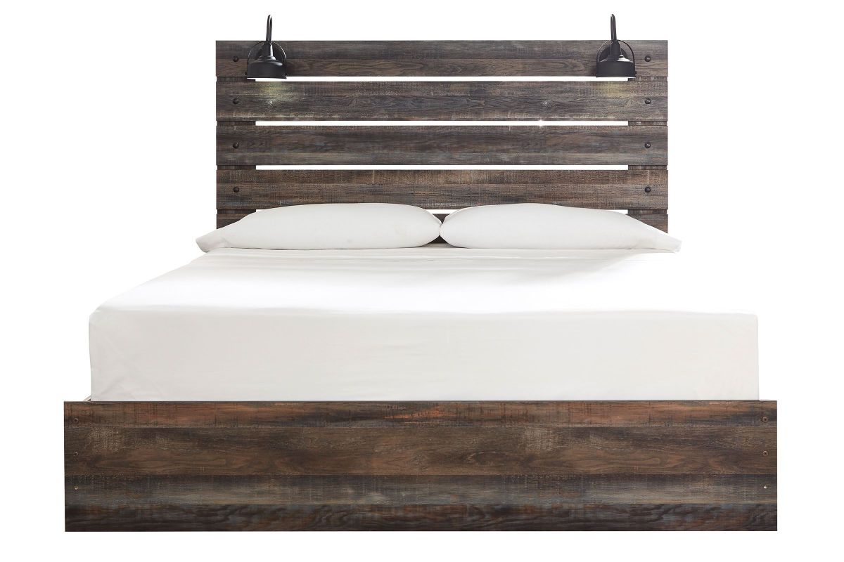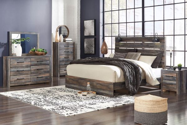 When merged in just the right way, rustic and industrial styles can make one happy marriage. Case in point: the Wilder bedroom set with panel bed, chest, dresser, mirror, and nightstand. A refined take on barn board beauty, its complex, replicated wood grain showcases hints of burnt orange and teal tones for a sense of weatherworn authenticity. Those who love to read in bed are sure to find the retro-chic light sconce and USB plug-ins on the open-slat style headboard such a bright idea. Additional USB plug-ins with the nightstand keep you up to speed.