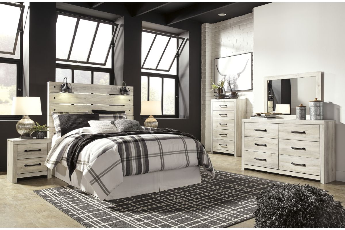 What a delightful take on rustic industrial style. Whether modern loft or modern farmhouse, the Cambeck panel bed makes itself at home. The wispy whitewash palette enhances without covering the grain for that weathered look you crave. Love to read in bed? You’re sure to find the retro-chic light sconces