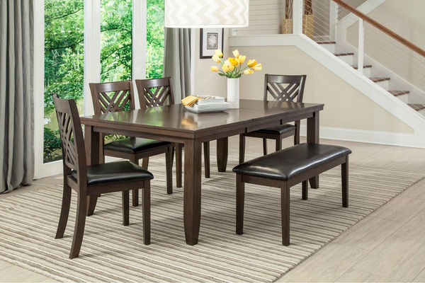The Lebaron Collection is a beautiful and classic dining room set that anyone can enjoy. The dark brown wood provides a durable and stunning collection pieces. Matching side chairs have a beautiful crossed design that will stand out in your dining room. Change it up and add a bench to your dining table! Upholstered cushions are on the chairs and bench to provide comfort and style. The Lebaron Collection is a perfect dining set for those who want to entertain in style!
