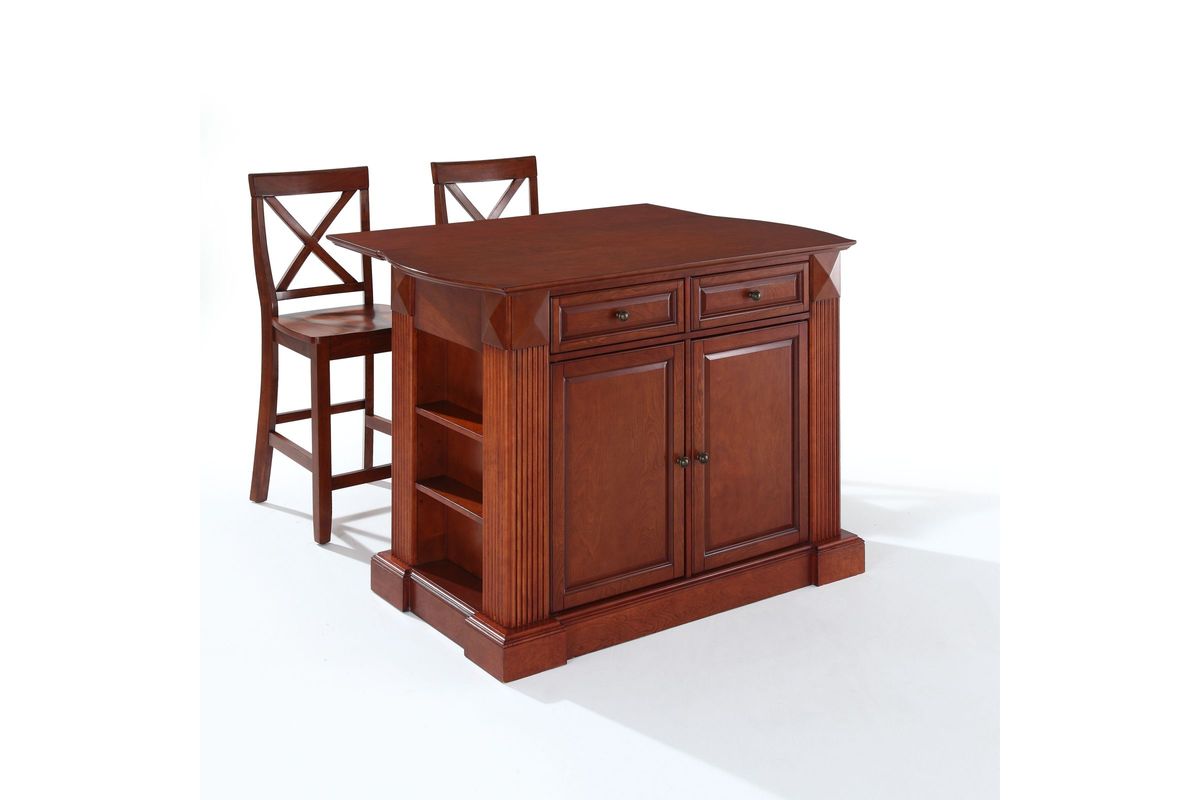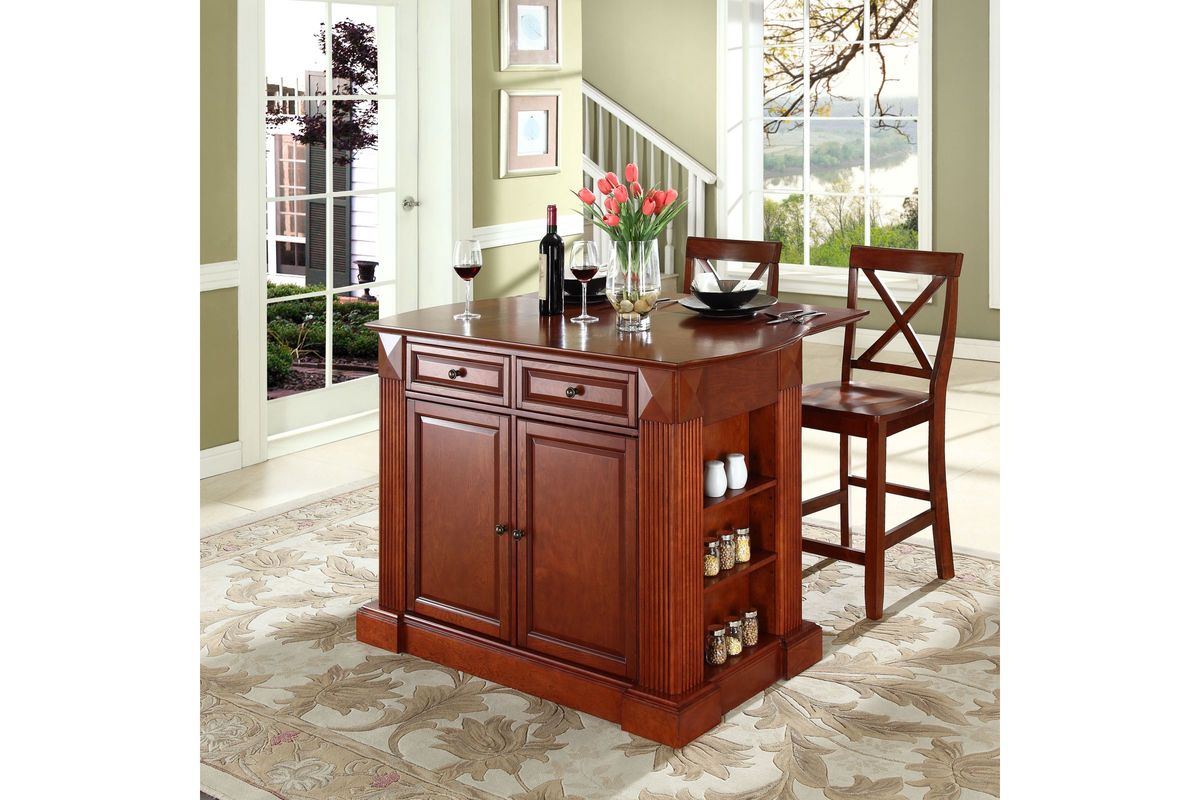 Sorry, the Coventry Drop Leaf Breakfast Bar Top Kitchen Island in Cherry + Two 24" Cherry Stools is no longer available. We've left this page up for reference only. Check out the great alternatives on this page or call 248-481-2208 or Chat with a Gardner White Sales Specialist about similar products.