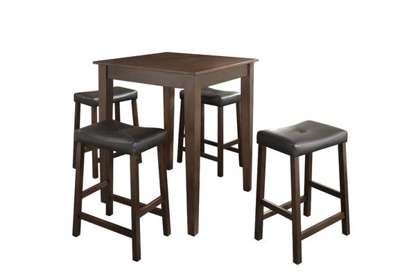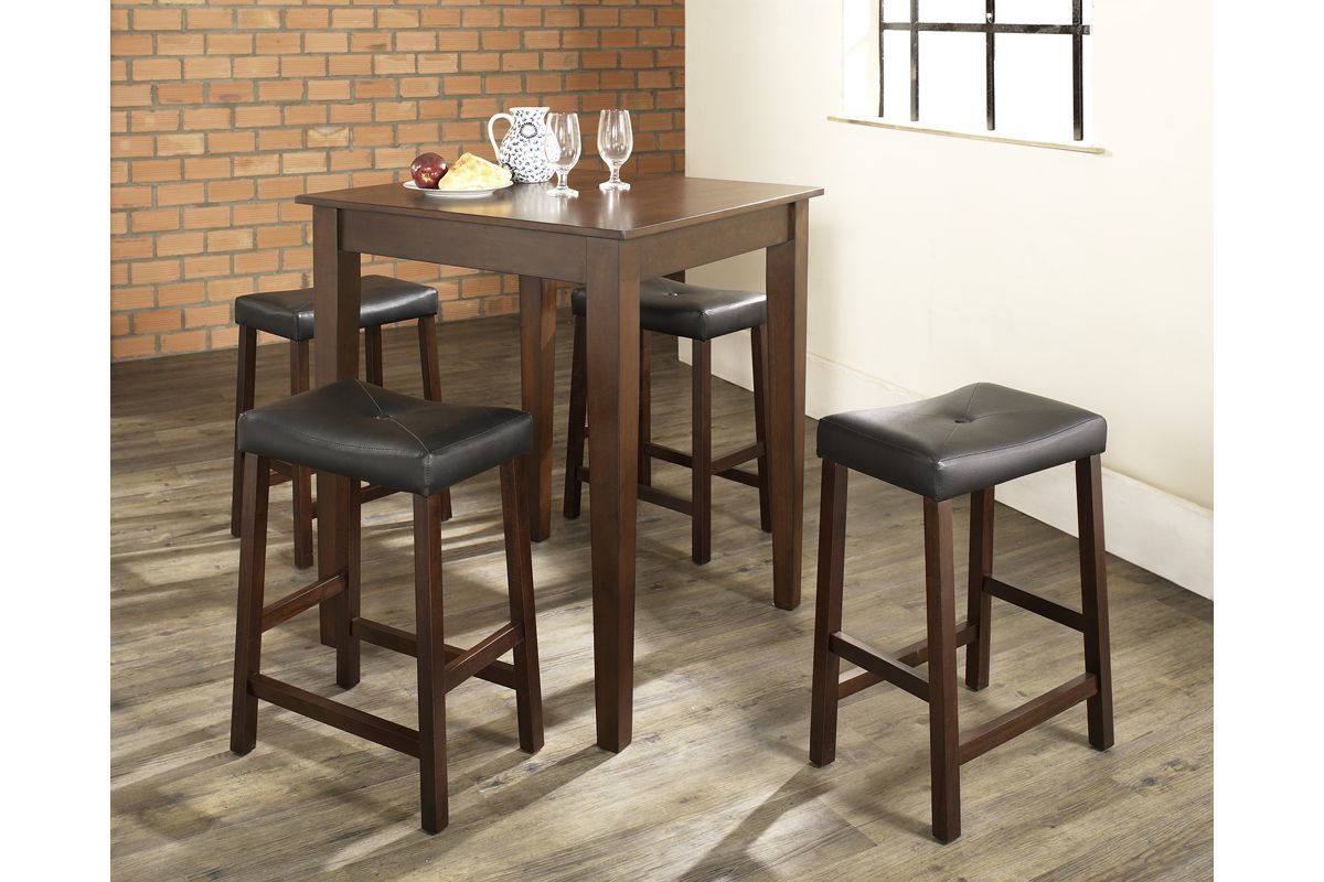 Sorry, the 5 Piece Pub Dining Set with Upholstered Saddle Stools in Vintage Mahogany is no longer available. We've left this page up for reference only. Check out the great alternatives on this page or call 248-481-2208 or Chat with a Gardner White Sales Specialist about similar products.