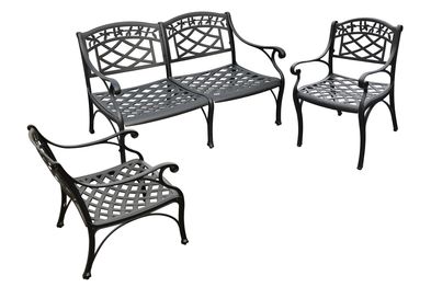 It may be hot outside, but youÕll feel cool kicking back in our heavy duty, solid-cast aluminum furniture. Designed for style and built to last, this outdoor conversation seating set features a durable charcoal black powder coated finish that will weather the harshest of outdoor conditions. Experience pure nirvana while unwinding in the chairÕs comfortable contoured seats. Your very own outdoor oasis awaits you!