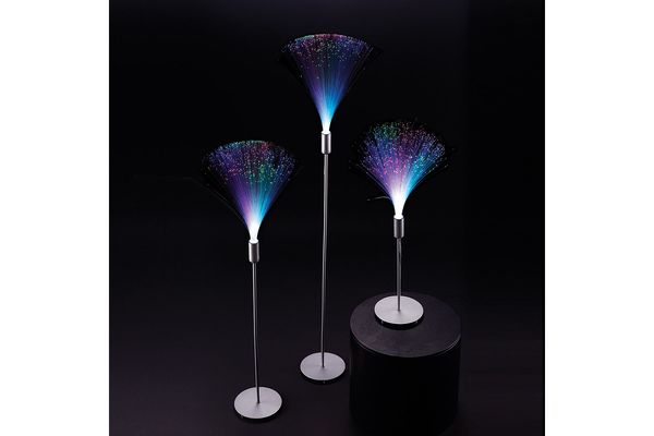 Hundreds of thin optic fibers fan out gracefully while multicolored phasing LEDs slowly illuminate each fiber for a hypnotic effect. The lamp is adjustable to three height levels by adding or removing sections.