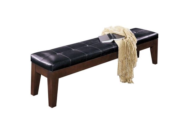 Straightforward design of this upholstered dining room bench serves a timeless look at every meal. Tufted faux leather softens the cushioned seat. Warm finish exudes pleasingly rustic character that simply feels right at home.