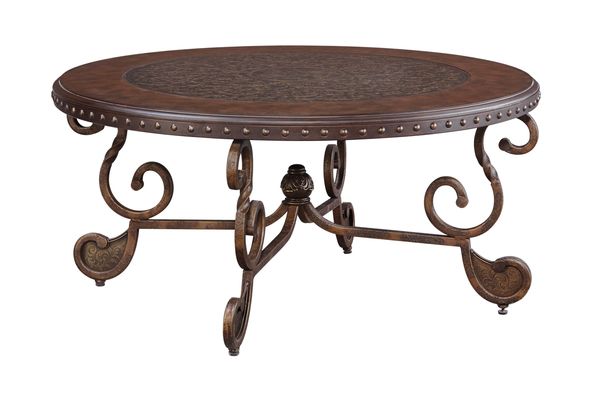 Surrounding yourself with beautiful things is perfectly embodied by this coffee table. The spectacularly finished metal and nailhead-accented top is supported by a scrolled metal base in an antiqued tone.