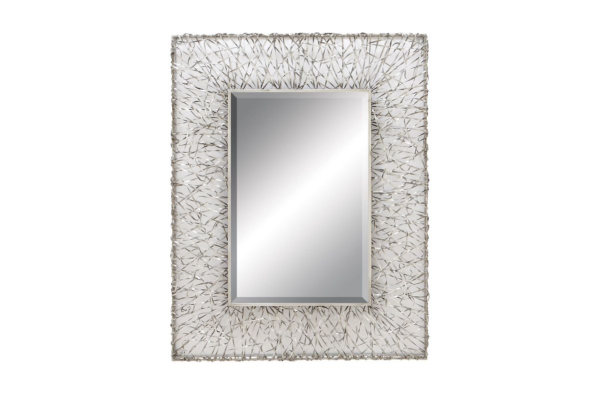 42" Contemporary Beveled Wall Mirror with Abstract Silver Finish Metal Ribbon Caged Frame