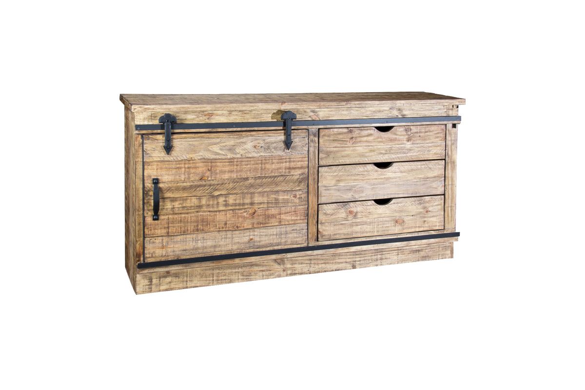 The Franklin TV Stand is made from solid pine woods and has handcrafted iron metal accents. This TV stand provides ample storage for your living room and holds up to a 65" TV! Features a sliding door that hides shelving and three full extension drawers. It is designed to bring an eclectic mix of style in your home. The rustic reclaimed finish varies from piece to piece, giving your selection piece a unique and personal feel.