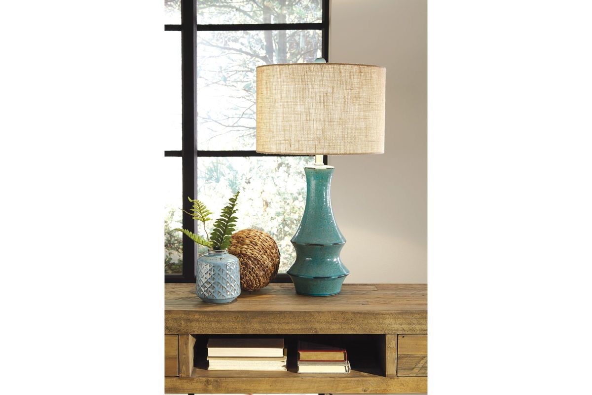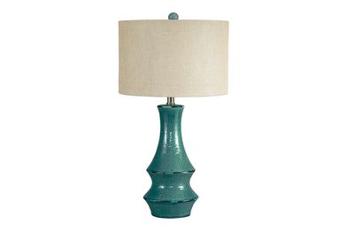 When you need light, turn on the brilliance and modern flair of this table lamp. Whether curling up with a book or hosting guests, this lamp will meet your needs around the clock. A translucent burlap shade attaches with a ball finial. Bold style is defined in its teal glazed ceramic that has rubbed black accents-pairs wonderfully with contemporary furniture.
