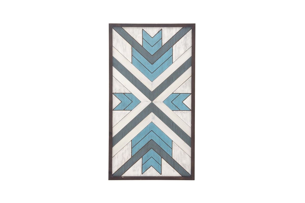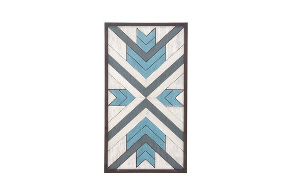 23" x 43" Modern Reflections wood wall décor, rectangular wall décor made of mixed Chinese Fir wood and MDF, features matte black frame, faded white inner wood panel, lattice pattern central accent with brushed cyan, blue and white finishes