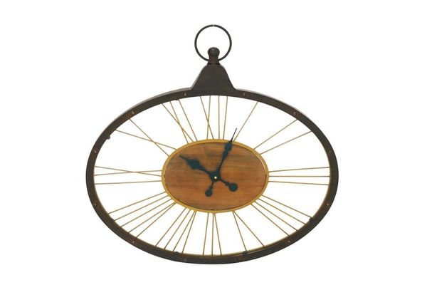 28" X 26" Rustic Reflections iron, wood and glass oval spoke numerals wall clock, distressed finish, black iron oval frame with tapered finial and loop ring, gold-finish spoke Roman numerals around oval center oak-finish fir 1 AA battery operated clock, black hands, clear glass panel front.