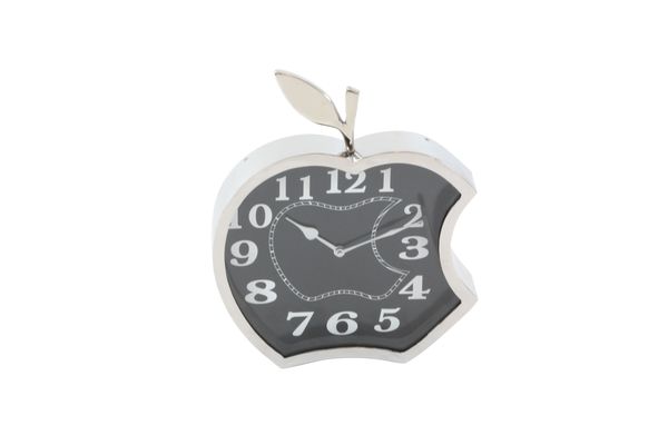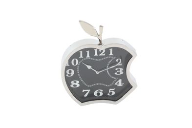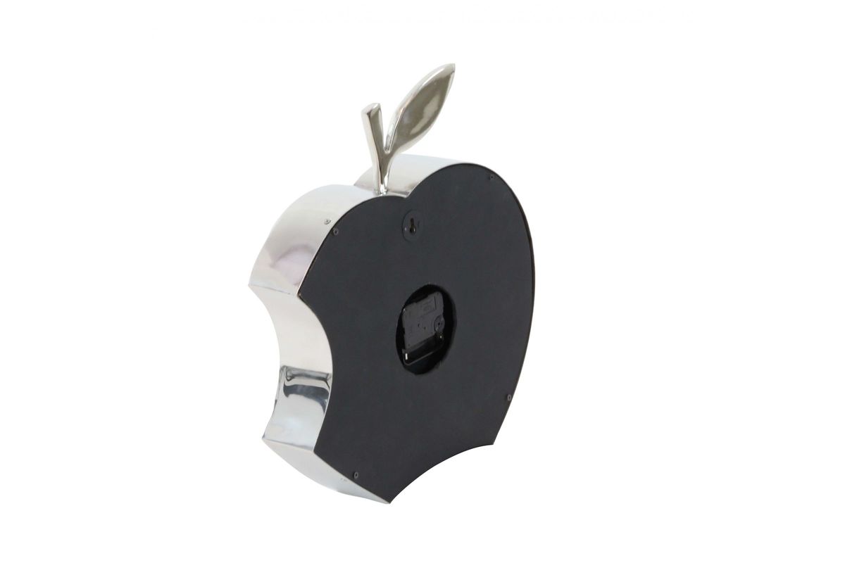 Modern Reflections stainless steel apple wall clock, made of mixed aluminum, stainless steel and plastic, bitten-apple-shaped matte white body with a silver-finished leaf and stem, black clock face with a white dial.