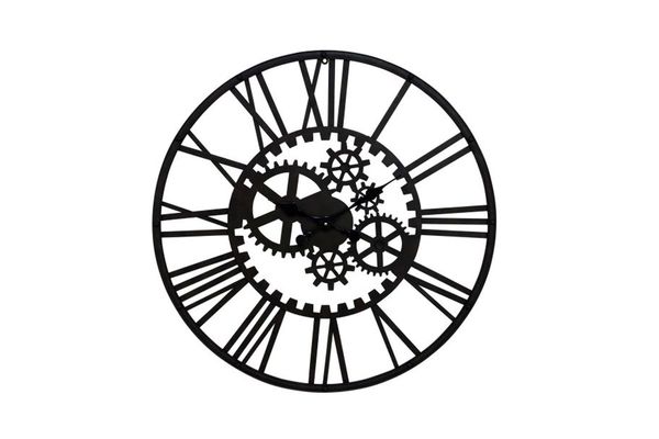 Vintage Reflections metal gear wall clock, matte black iron frame, round shaped with Roman number marking cutouts, gear-shaped cutouts on the clock face, metallic black clock hands, requires 1AA battery