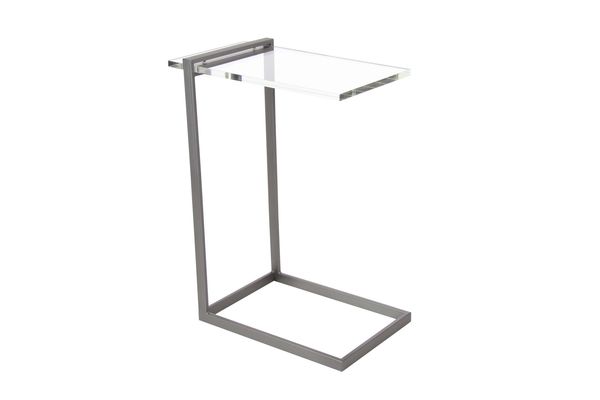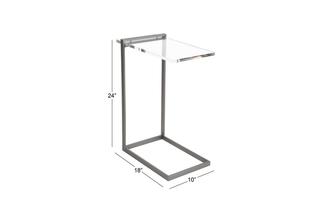18" x 24" Modern Reflections metal and acrylic accent table, features rectangular clear acrylic table top, L-shaped metallic gray iron frame with closed legs