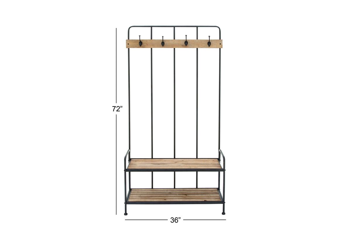 36" x 72" Rustic Reflections metal and wood coat rack, matte black iron frame, back support and legs, rectangular light brown fir wood crossbar with four matte black hooks, slat type rectangular light brown fir wood top and bottom shelves, assembly required