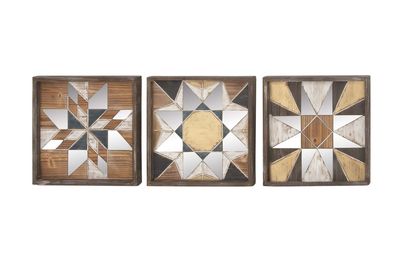 Set of 3, 15", 15", 15" Rustic Reflections wood wall décor, square wall decors made of Chinese Fir wood and MDF, features stained dark brown frames and brown back panel, geometric lattice pattern accents with white, blue and yellow patina finish design