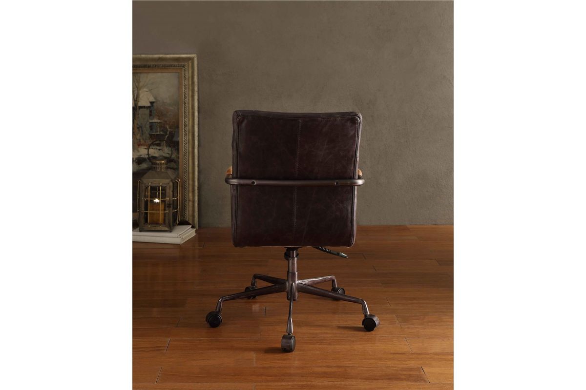 The Harith office chair brings comfort and style to any work space. Handsome, channelseamed antique ebony top grain leather upholstery is complemented by a metal base with casters and metal frame armrests. It's Industrial design promise comfort and function as well as stylish style. Some Assembly Required.