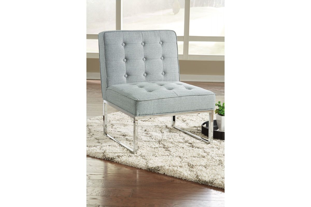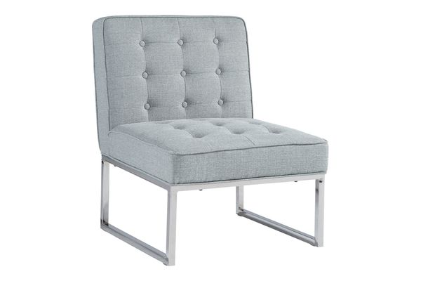 Button-tufted seat? Yes, please. This armless accent chair allures with contemporary appeal. Gorgeous chrome-tone base supports two comforting light gray cushions. Its neutral aesthetic complements your home with an upscale touch.