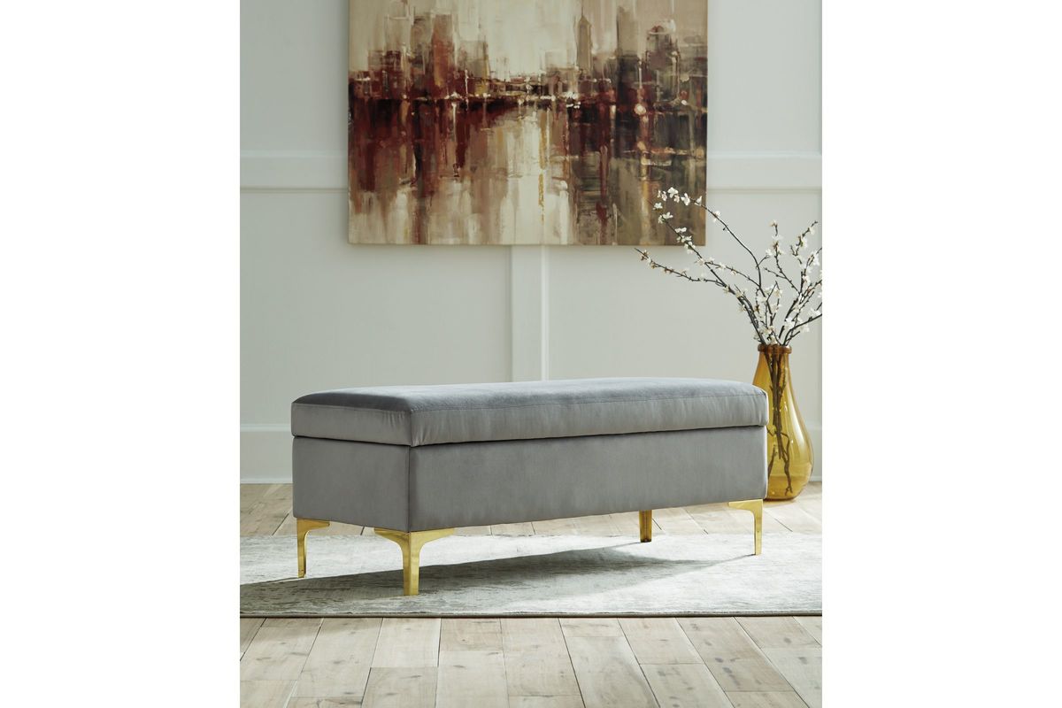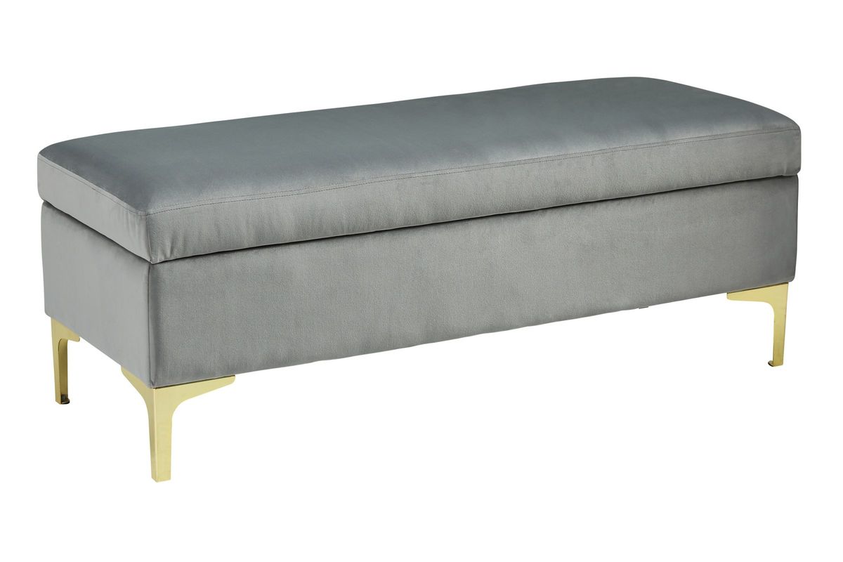 Is your home missing that one last special touch? This storage bench does the trick. Its fresh, modern edge is amplified with soft gray velvet fabric and swank goldtone legs. Storage function makes this more than just a fashion piece. Lift the top to quickly tuck away excess clutter.
