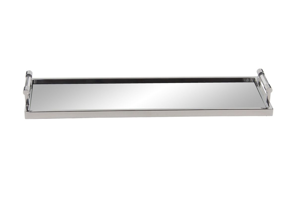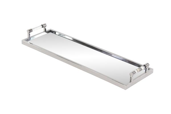 10" x 23" Contemporary tray, crafted from stainless steel, features a silver finish, features a rectangular mirror bottom, designed with two acrylic handles.