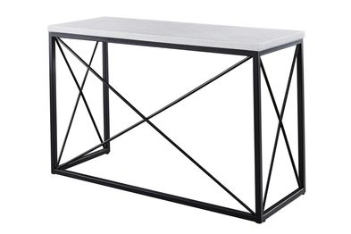 A modern occasional sofa table featuring a unique modern latticework iron base with stunning white marble tops. This mixed media table feels light and airy but its marble tops give extra durability for heavy duty use in the toughest environments, the family room. Bring style and beauty to your living room with the Skyler White Marble Sofa Table.