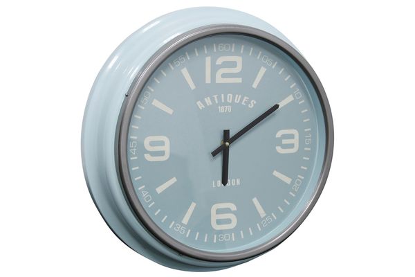 The Light Blue Round Wall Clock features a light blue metal exterior with a gray rim around the face. It displays four large numbers in white and the seconds in sequences of fives.