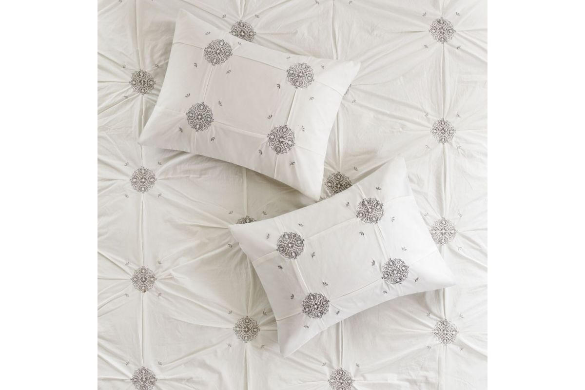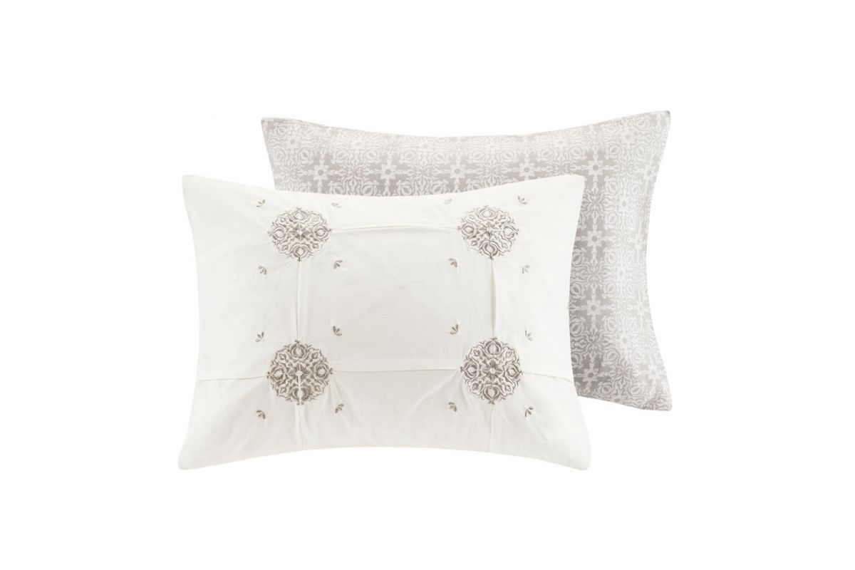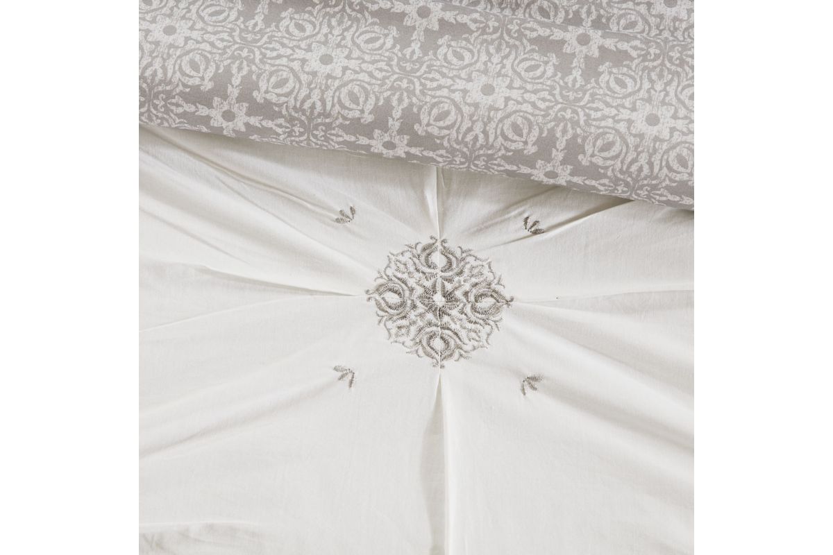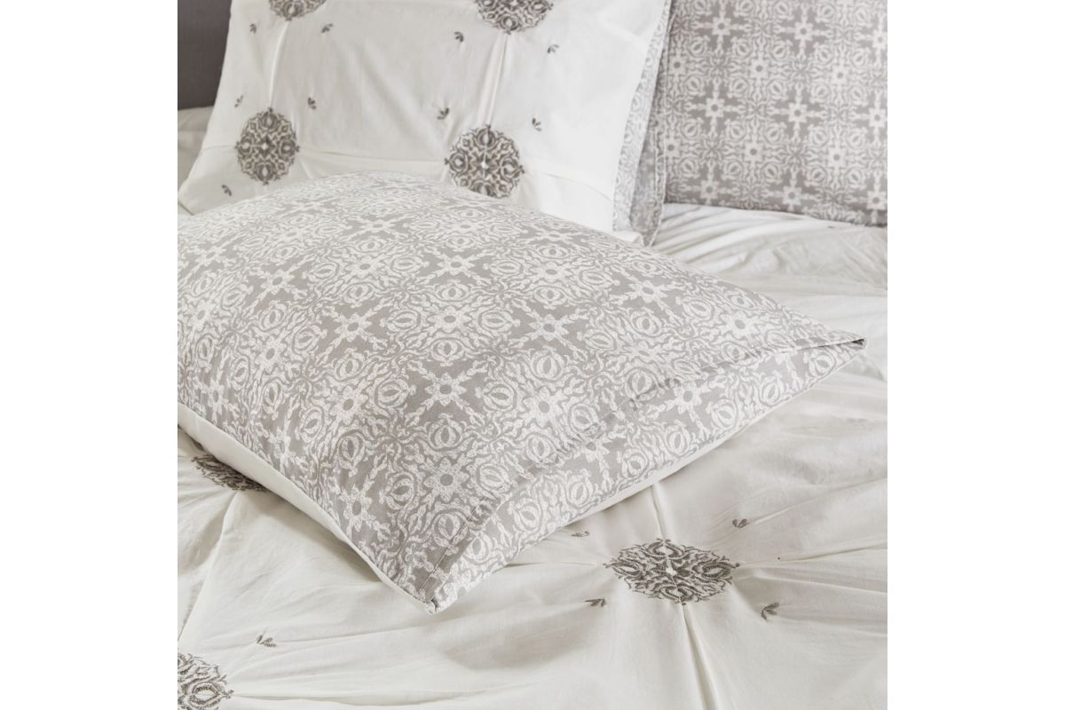 Style your bedroom with the shabby chic allure of the Malia 6-Piece Embroidered Cotton Reversible Comforter Set. The face of the reversible comforter features tufted grey embroidery on an ivory base, while the reverse showcases an all-over grey medallion print that complements the top of the bed. Two matching shams mirror the face of the cotton comforter and two grey Euro shams match the reverse of the comforter. An embroidered medallion design on the square decorative pillow provides an elegant finishing touch to the cotton comforter set. Machine washable for easy care, this reversible comforter set is made from 100% cotton and provides a comfortable shabby chic update to your bedroom décor.