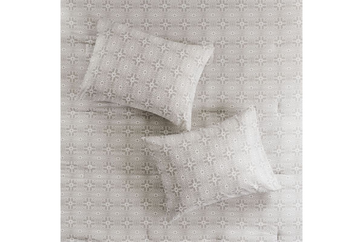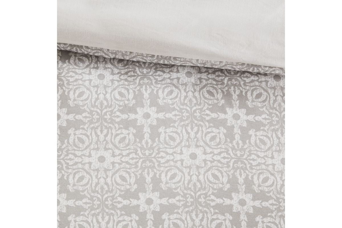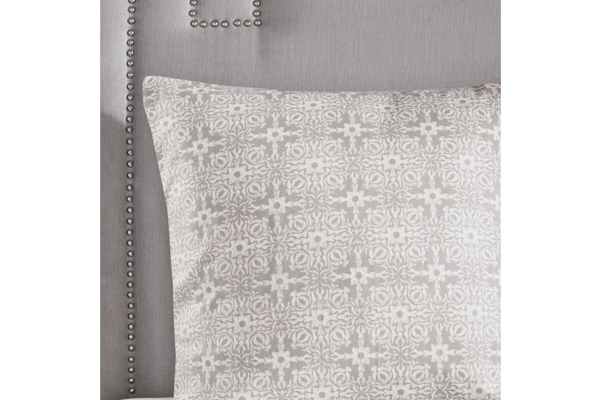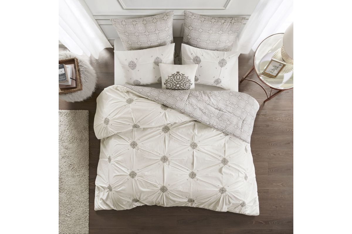 Style your bedroom with the shabby chic allure of the Malia 6-Piece Embroidered Cotton Reversible Comforter Set. The face of the reversible comforter features tufted grey embroidery on an ivory base, while the reverse showcases an all-over grey medallion print that complements the top of the bed. Two matching shams mirror the face of the cotton comforter and two grey Euro shams match the reverse of the comforter. An embroidered medallion design on the square decorative pillow provides an elegant finishing touch to the cotton comforter set. Machine washable for easy care, this reversible comforter set is made from 100% cotton and provides a comfortable shabby chic update to your bedroom décor.