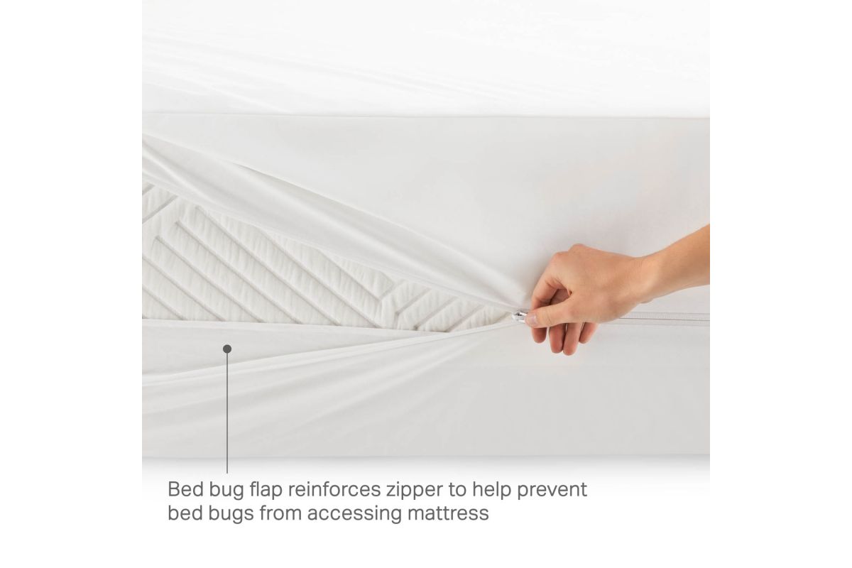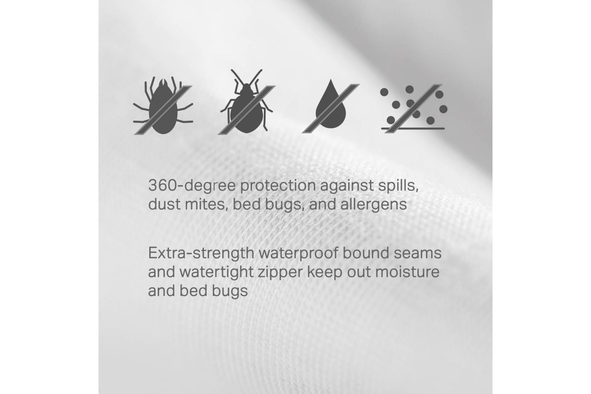 - Watertight bounded seams and reinforced zipper keep out moisture and bed bugs