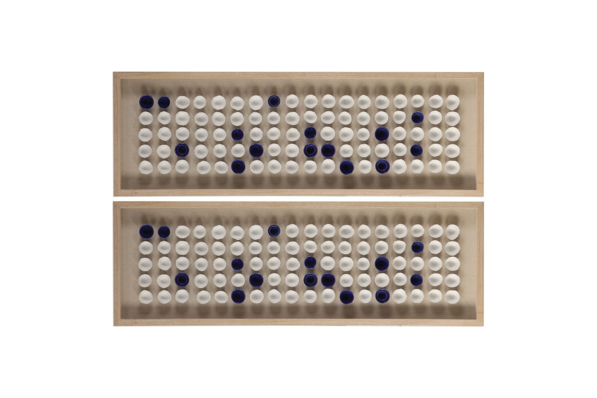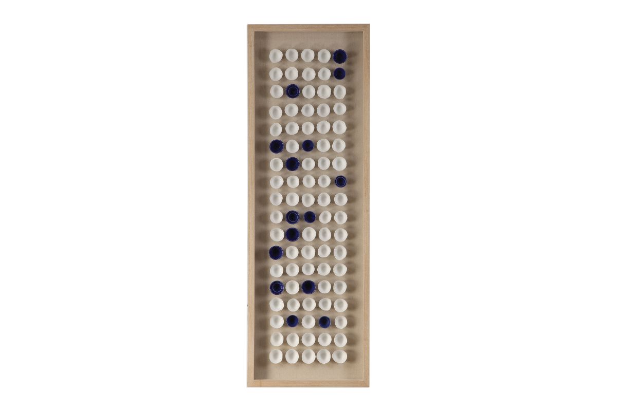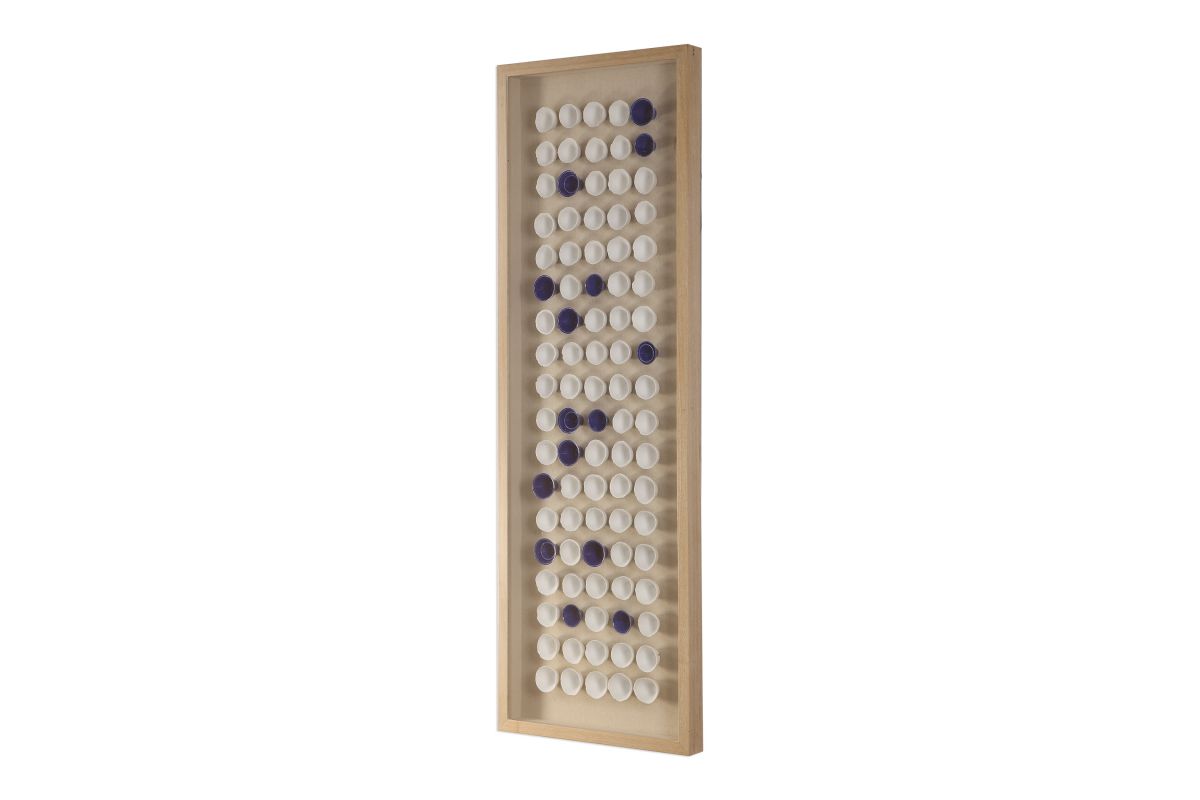- An Artfully Arranged Collection Of Handmade Ceramic Cups, Glazed In White And Royal Blue. Framed In A Naturally Finished Fir Wood Shadow Box, With An Oatmeal Linen Liner. Due To The Handcrafted Nature, Each Piece Will Vary.