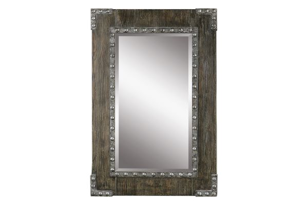 Rustic, Aged Wood Finish Accented With Heavily Burnished Silver Strips With Ornate Nail Head Details. Mirror Has A Generous 1 1/4" Bevel. May Be Hung Horizontal Or Vertical. For Added Versatility, This Item Is Treated So That It May Be Used Inside Or Outside.