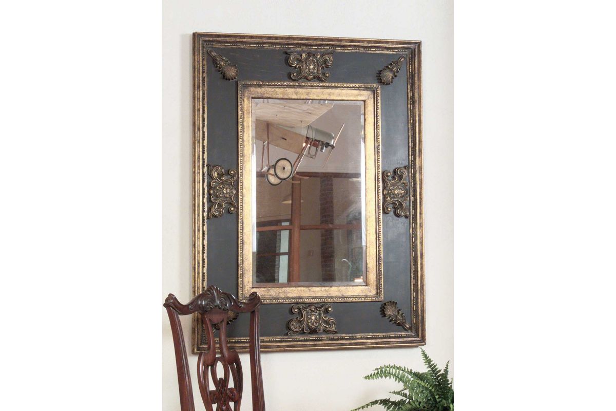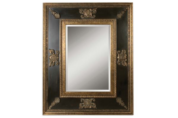 This Stately Mirror Has Antiqued Gold Leaf Inner And Outer Edges And Ornamentation. The Inside Panels Have A Distressed Black Finish With Green Glaze. Generous 12" Wide Frame. Mirror Is Beveled.