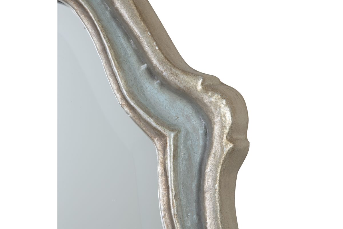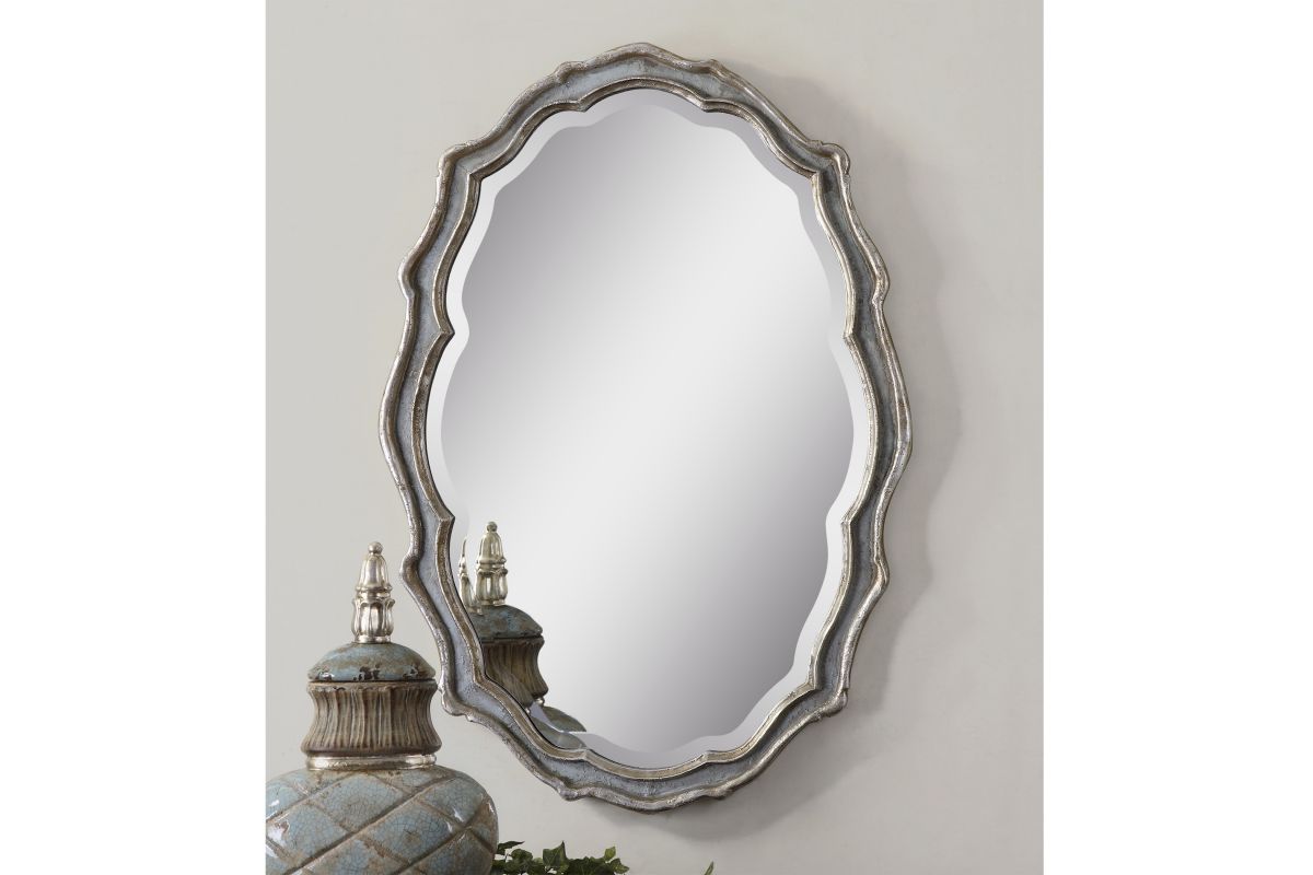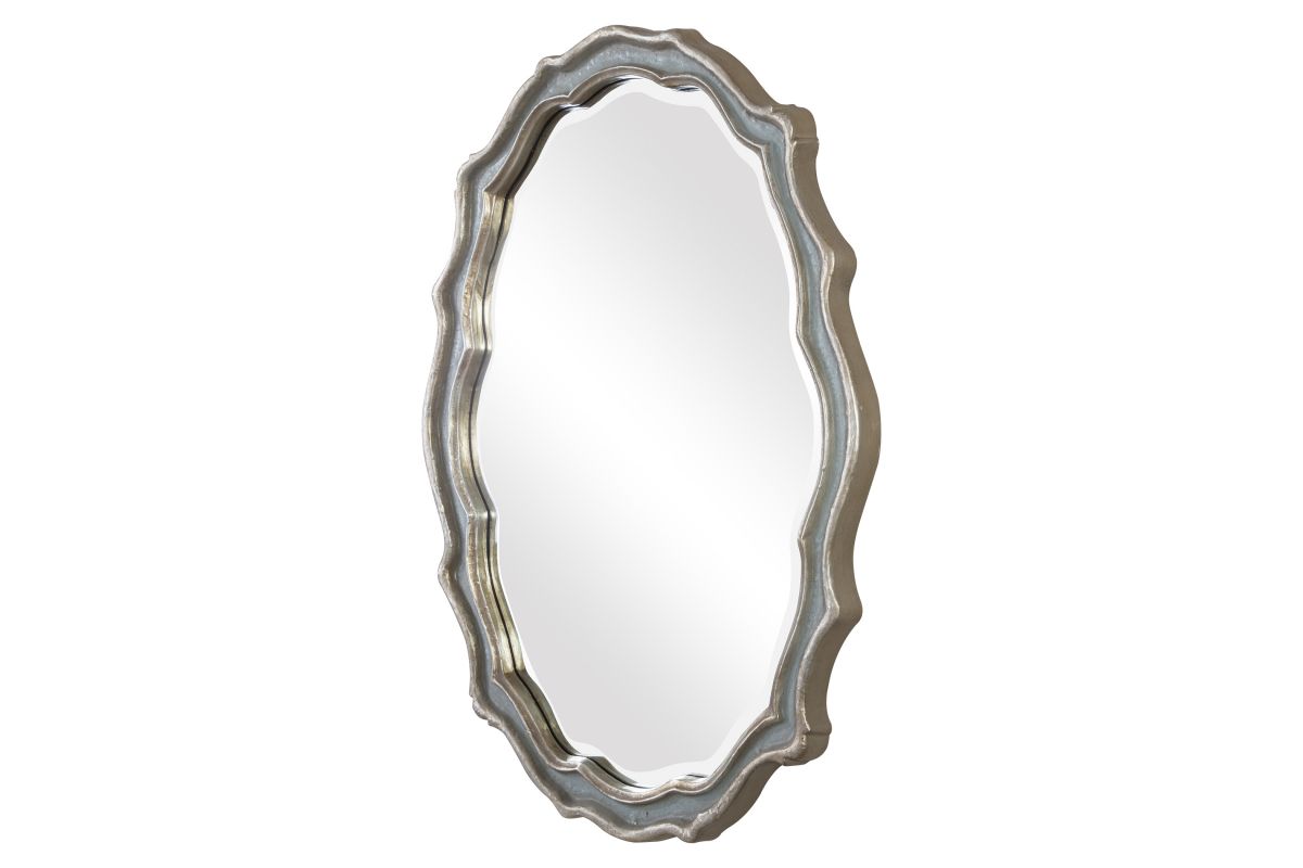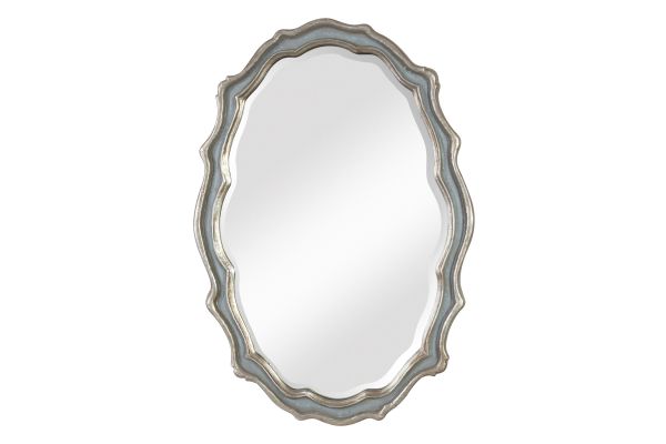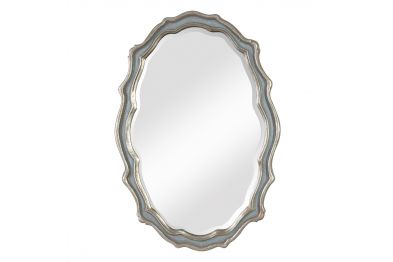 This Curvaceous Mirror Features A Frame Finished In Aged, Slate Blue Accented With Antiqued Silver Leaf Details And A Light Gray Wash. Mirror Has A Generous 1 1/4" Bevel. May Be Hung Horizontal Or Vertical.