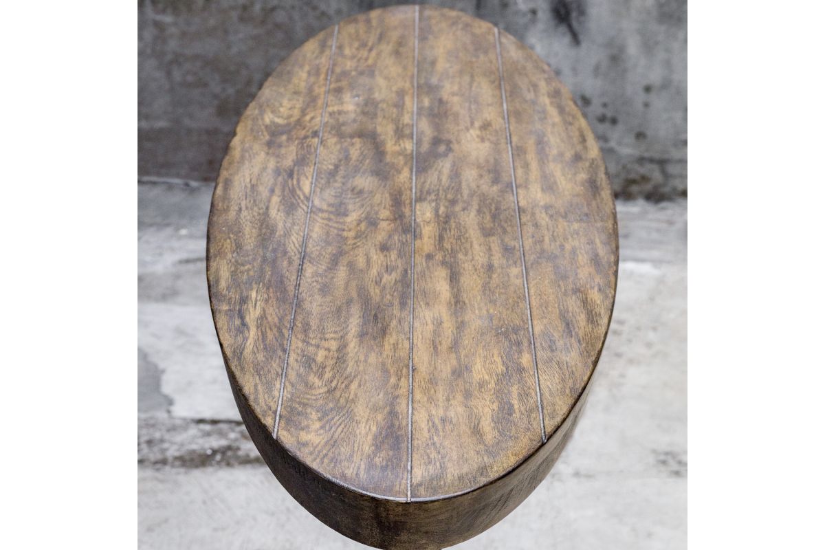 - Industrial Inspired, Featuring A Heavy Cast Iron Base Finished In An Aged Steel, Supporting A Tapered Oval Top. Planked Hardwood Platform Is Finished In A Weathered Light Walnut With An Aged Gray Wash.