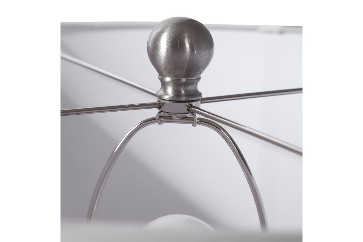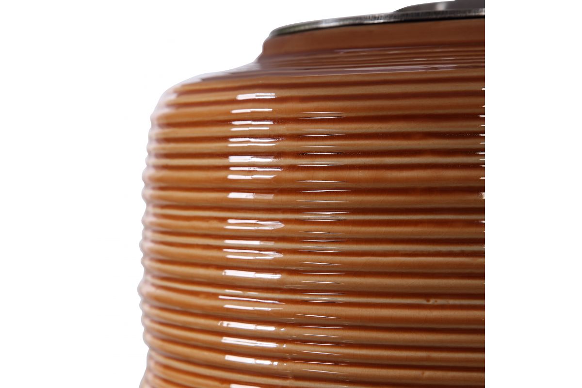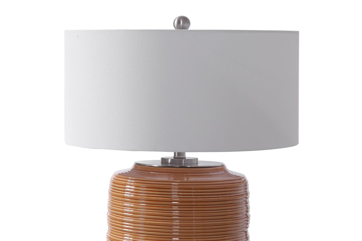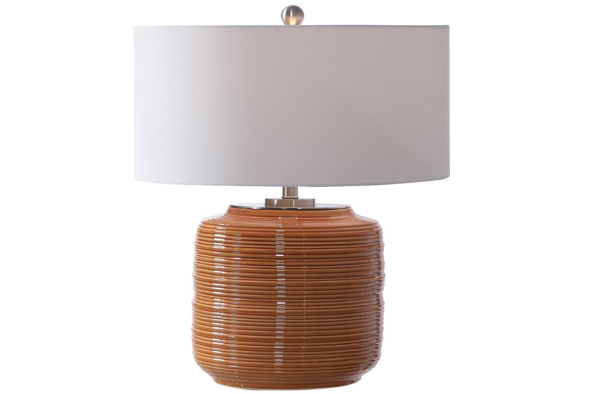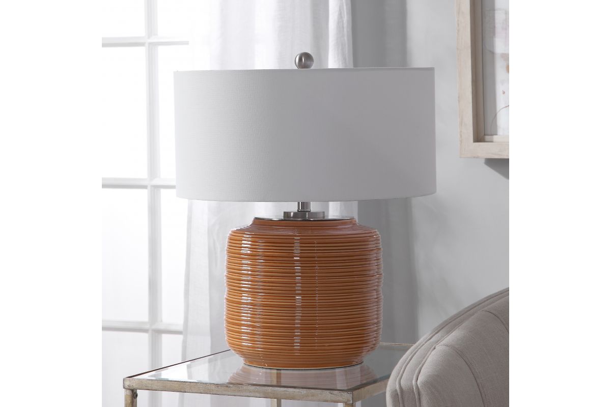 Add A Touch Of Retro Flair To A Design With This Ceramic Table Lamp. The Ribbed Base Is Finished In A Bright Orange Hue And Is Accented By Brushed Nickel Hardware. The Lamp Is Paired With A White Linen Drum Shade.