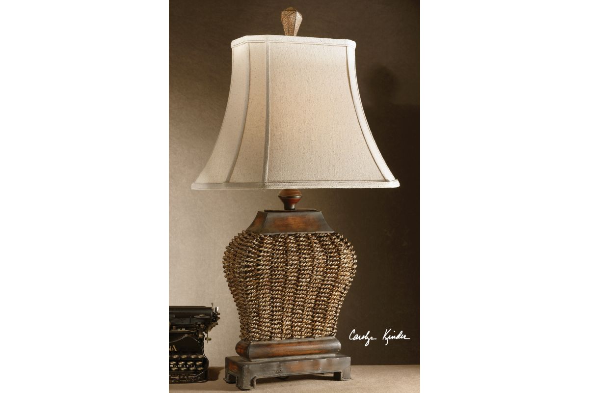 Hand Twisted, Woven Rattan, Wrapped Around A Metal Cage That's Finished In A Rubbed, Rust Mahogany, Accented With Burnished Edges. The Rectangle Bell Shade Is A Beige Linen Fabric With Natural Slubbing And Clipped Corners.
