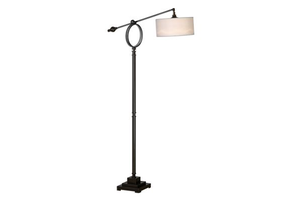 Sleek Metal Base Finished In A Plated Brushed Dark Bronze. The Suspended Round Hardback Shade Is A White Linen Fabric With Light Slubbing. This Lamp Features An Adjustable Shade Arm And A Pivoting Shade.