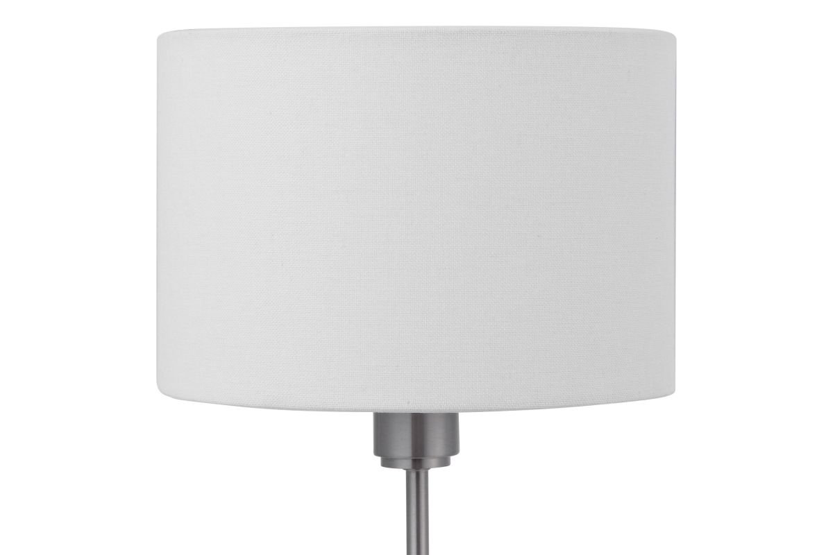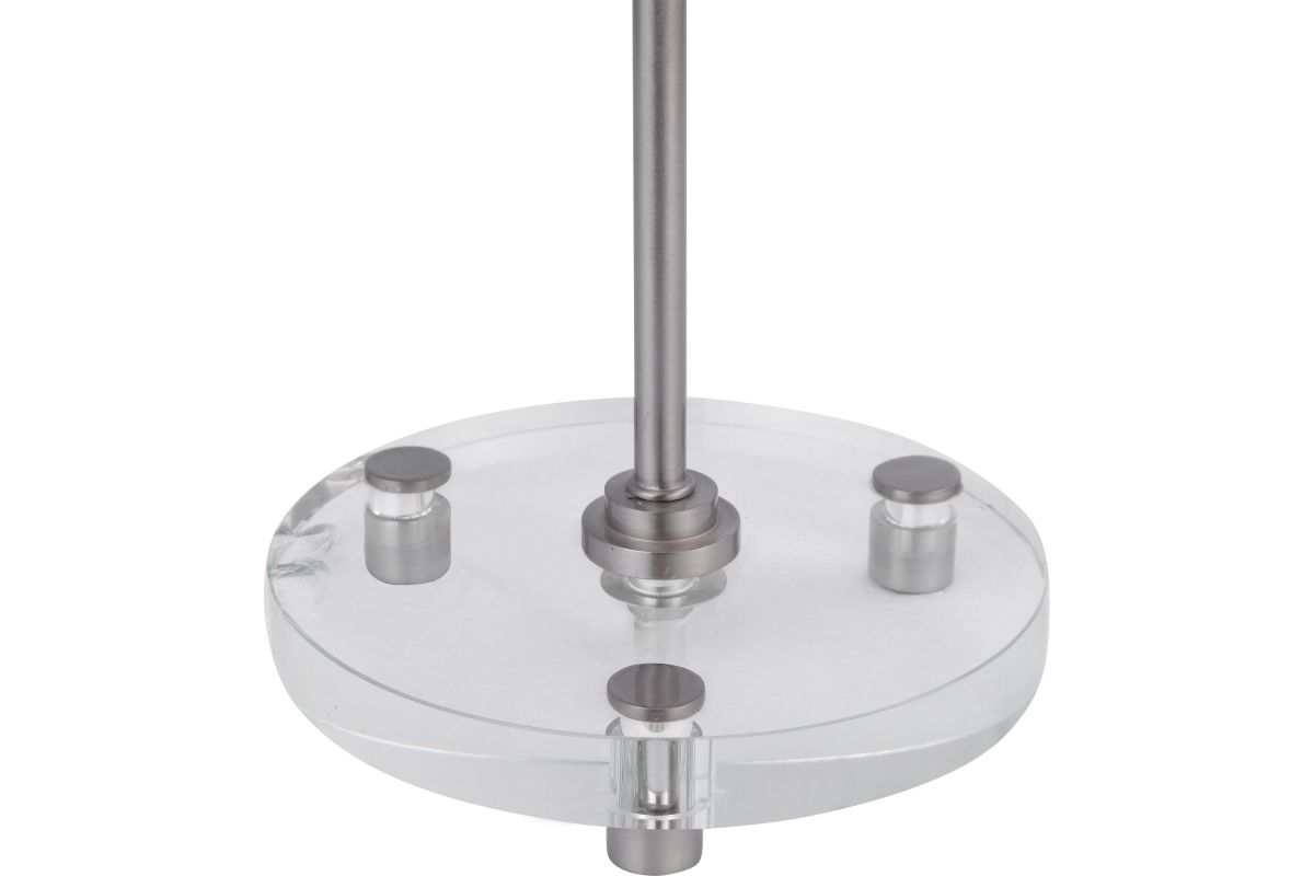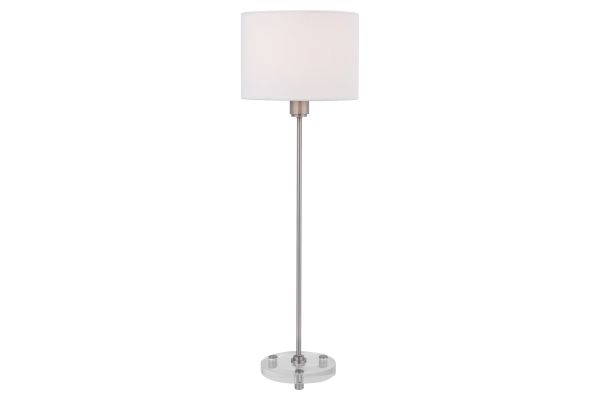This Simple, Contemporary Table Lamp Features Clean Lines And A Versatile Style. The Iron Base Is Finished In A Plated Brushed Nickel, Displayed On A Thick Crystal Foot. The Round Hardback Drum Shade Is A White Linen Fabric.