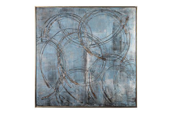 - Hand Painted Canvas With Denim Blue And Charcoal, Walnut, Silver Gold, Black And White Textured Colors Applied.