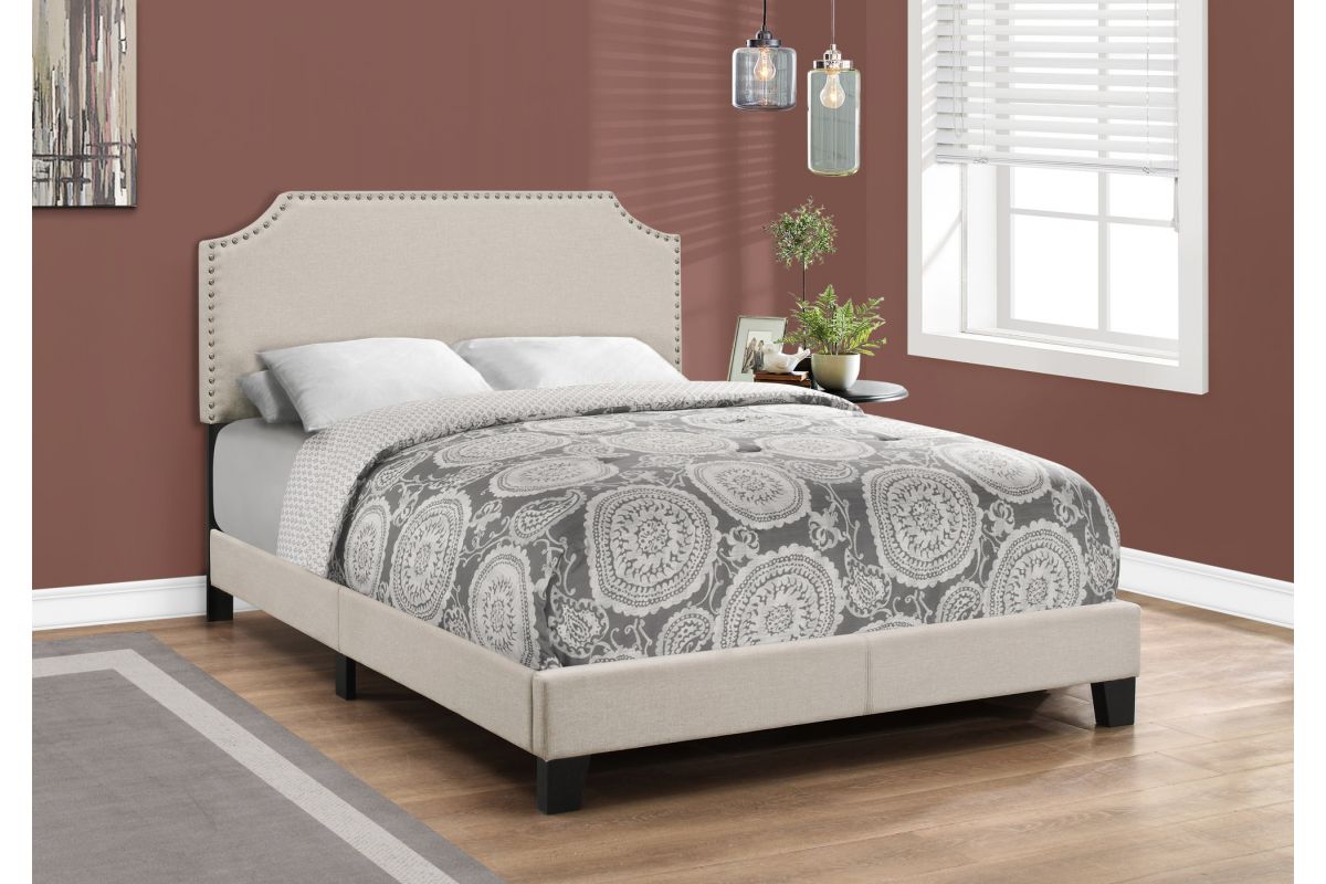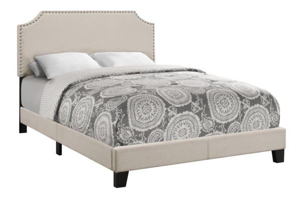 Add style, elegance and a comfortable element to your bedroom with this contemporary designed full size bed frame. Featuring a chic beige linen-look fabric with stylish antique brass metal nailhead trim and arched cutout silhouette this bed will surely be the focal point of any bedroom. The solid wood black feet give it that extra presence and durability. The box spring and mattress is not included and must be purchased separately. We recommend a 2 inch low profile box spring. All parts and hardware for assembly are conveniently located inside the headboard.