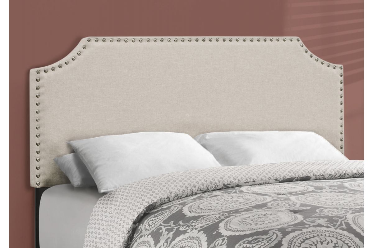 - Upholstered headboard, side and end rail in a chic beige linen-look fabric