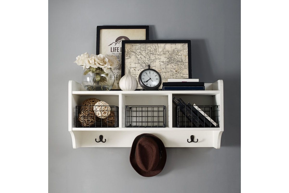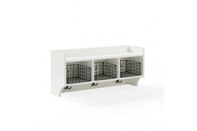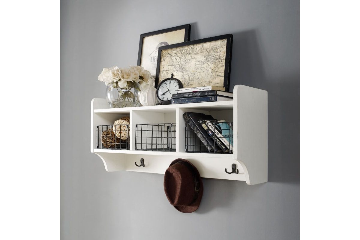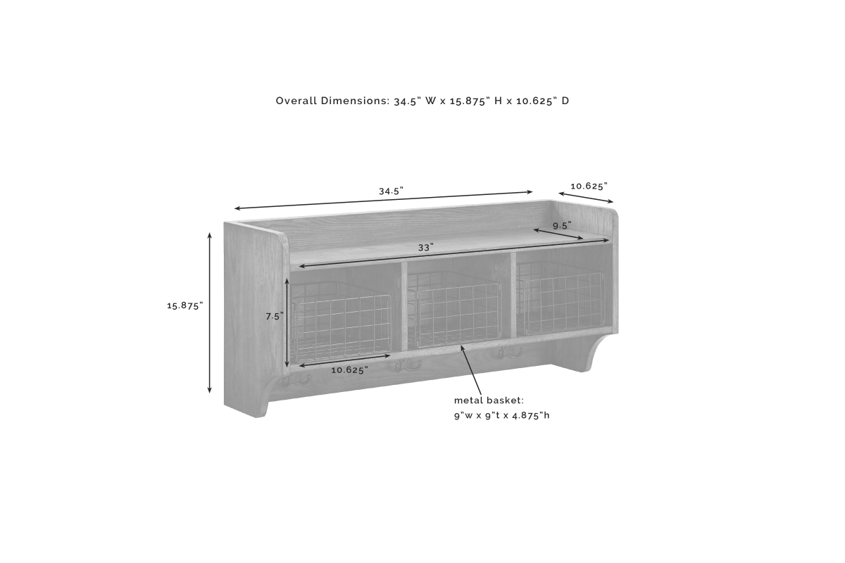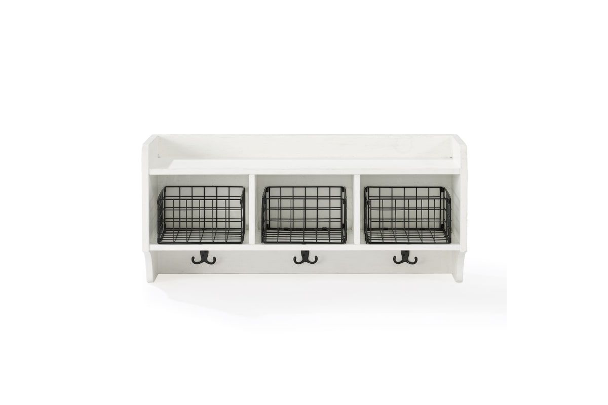 Keep your entryway clutter-free with the Fremont Entryway Shelf. The shelf includes three coat hooks and three galvanized wire baskets for storage. The shelf is easy to mount and can be paired with the rest of the Fremont Collection.