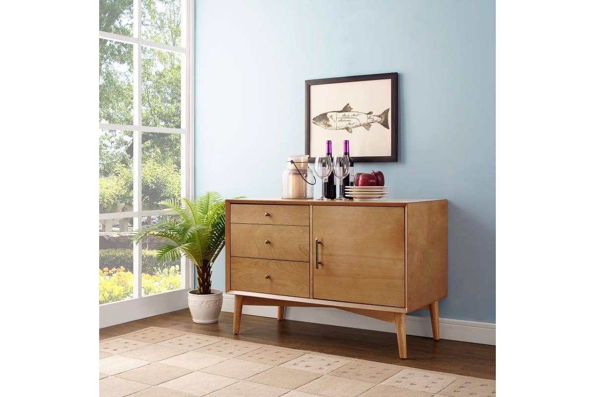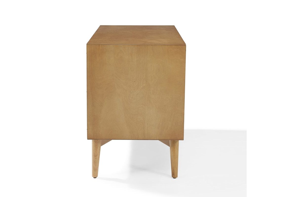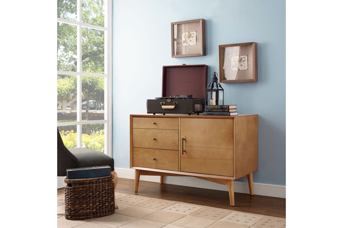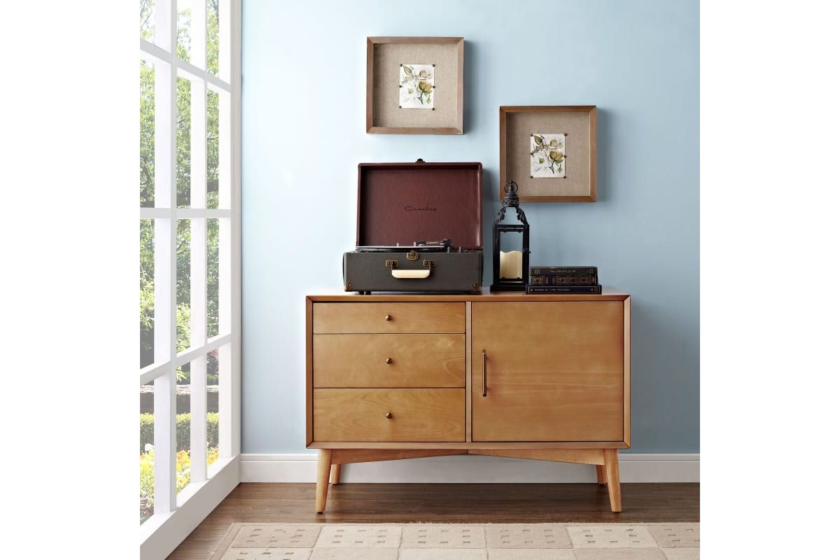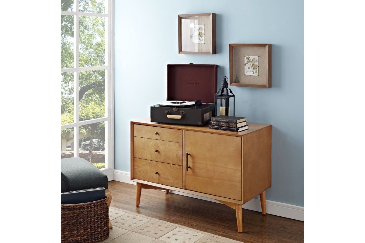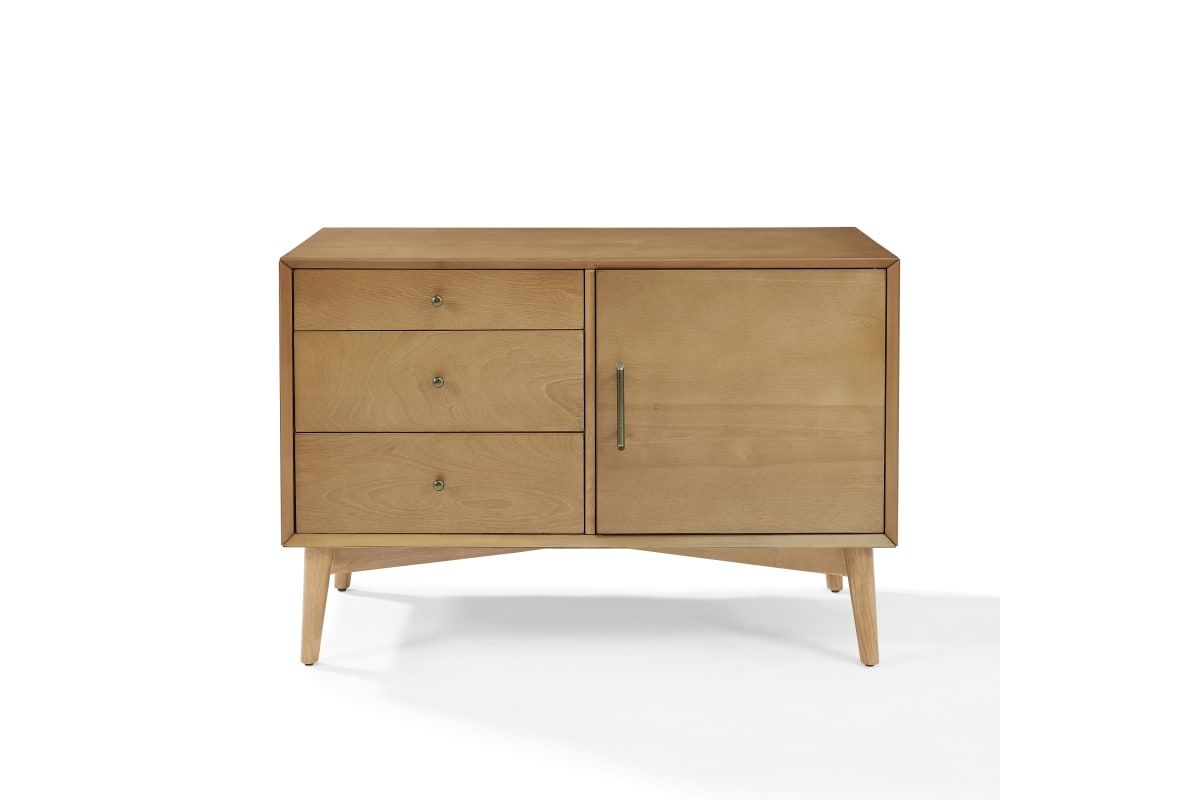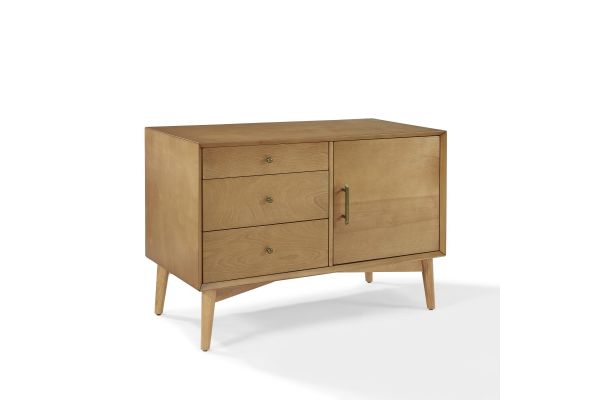 Taking cues from mid-century modern design, the Landon Media Console can serve as an innovative media cabinet or a sleek accent chest. Along with the spacious cabinet and adjustable shelves, the three side drawers roll out on full extension glides, giving easy access to every corner. With slender tapered legs and modern lines, the Landon Media Console brings elegant simplicity into any home.