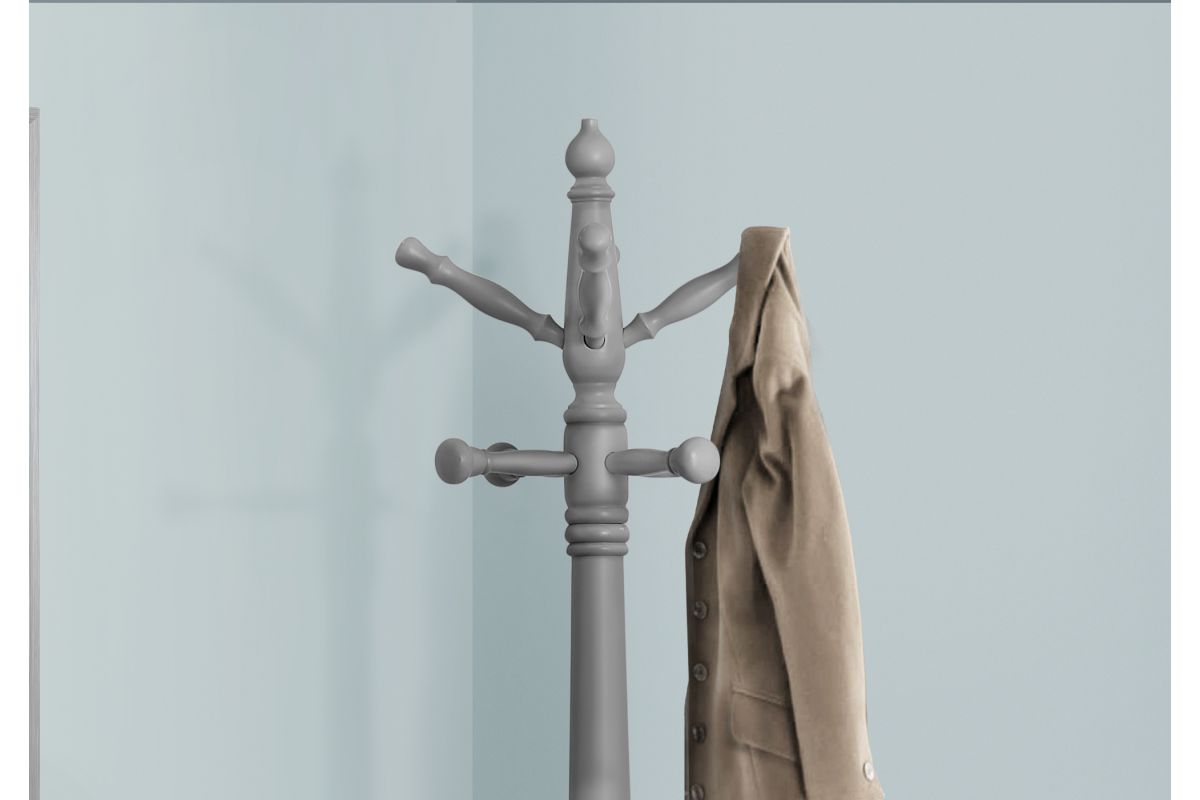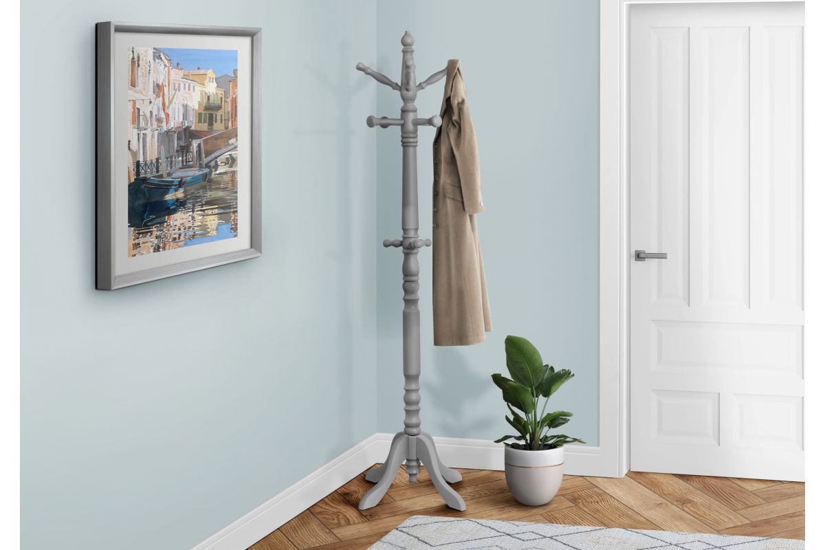 Delivering nothing but functionality and top notch style, this coat rack boasts 11 hanging pegs for all your coats, jackets and hats. Featuring 3 tiers, the coat tree will evenly hold apparel of different heights while keeping everything organized and easily-accessible. Thanks to a solid wood construction in a grey finish, this is your new must-have at the entrance, living room or even at the office.
