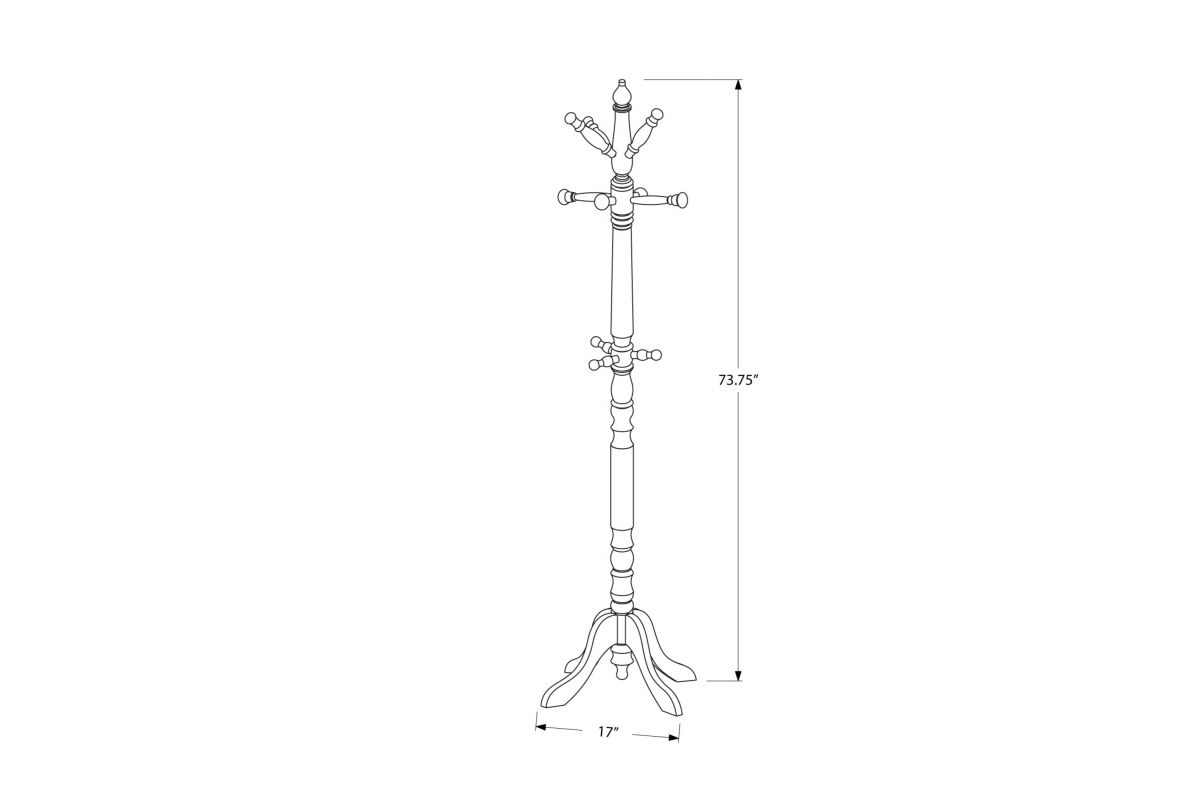 - sturdy free standing coat rack showing off a turn post style with its sturdy pedestal base